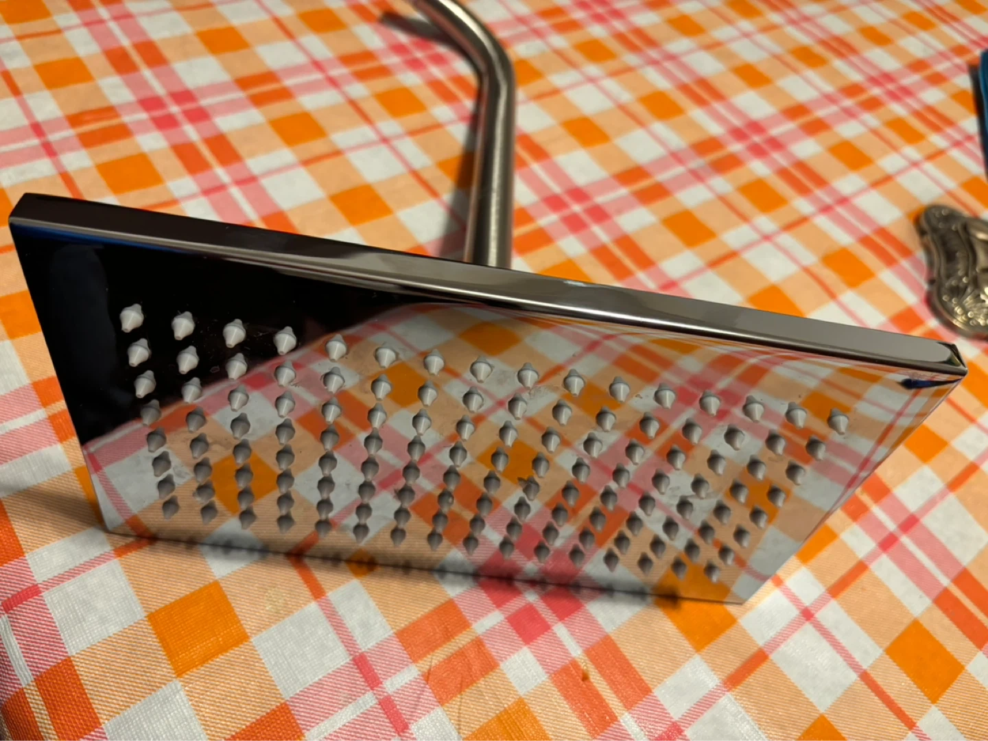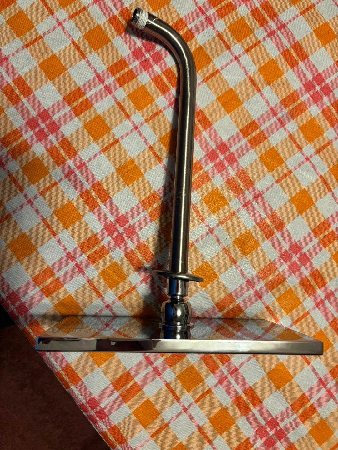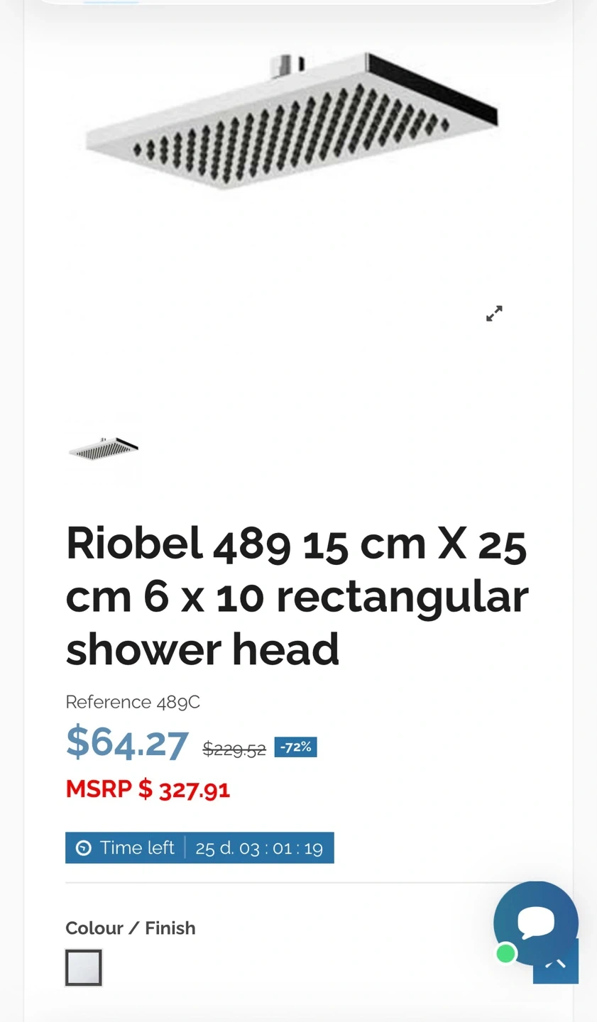 This Riobel shower head is 15 cm by 25 cm. It's a rectangular model with a chrome finish. It has 6 x 10 spray holes for a good rain water flow.