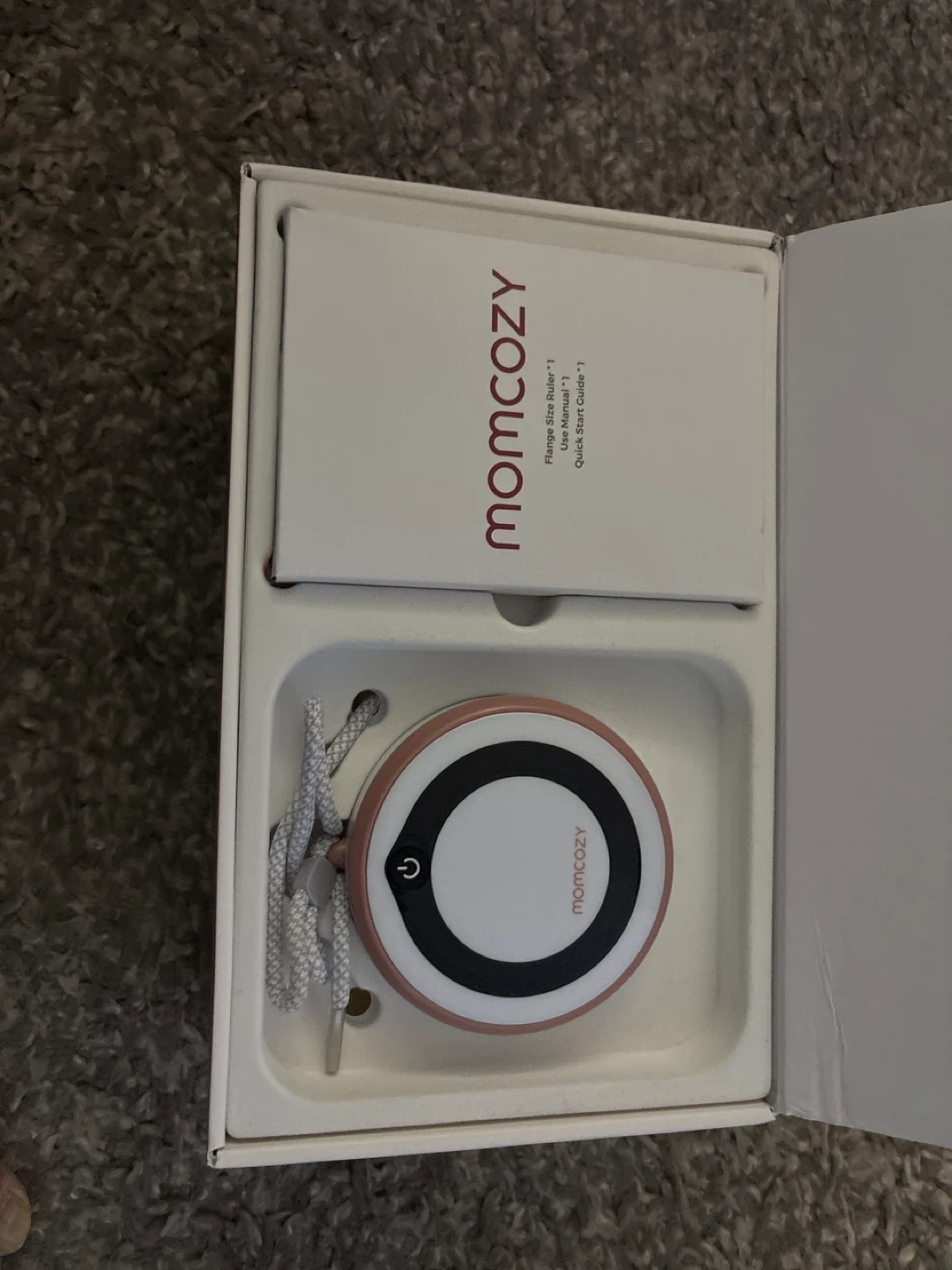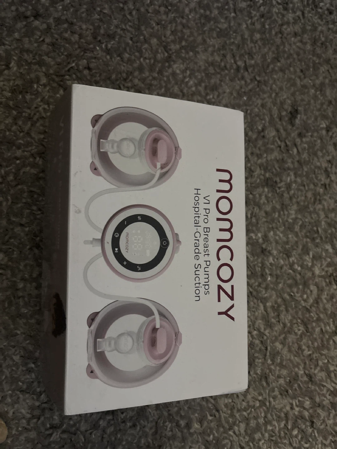 These Momcozy V1 Pro Breast Pumps offer hospital-grade suction. They come with a charging cable and manual. The unit is rose gold and white, with a digital display showing pump settings.