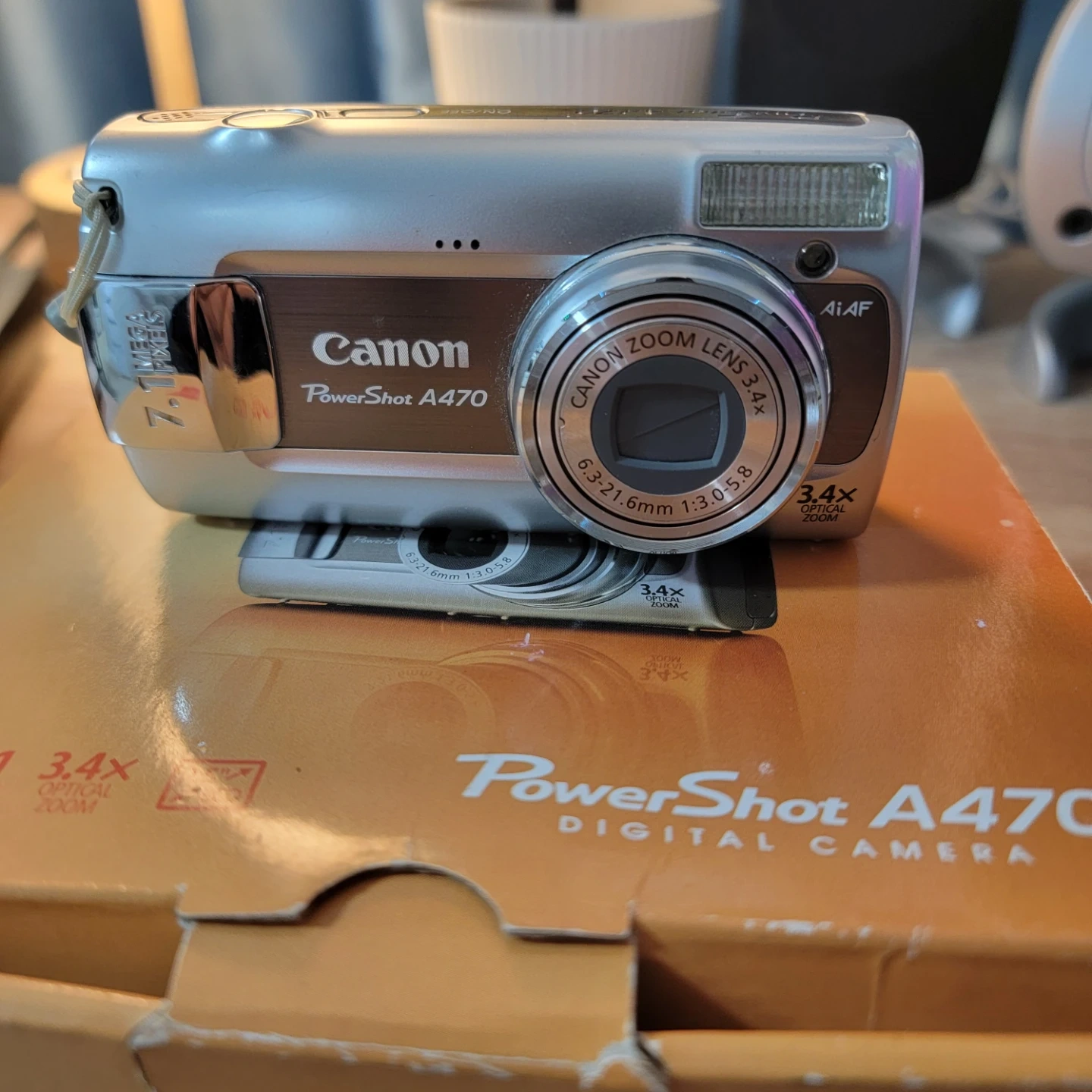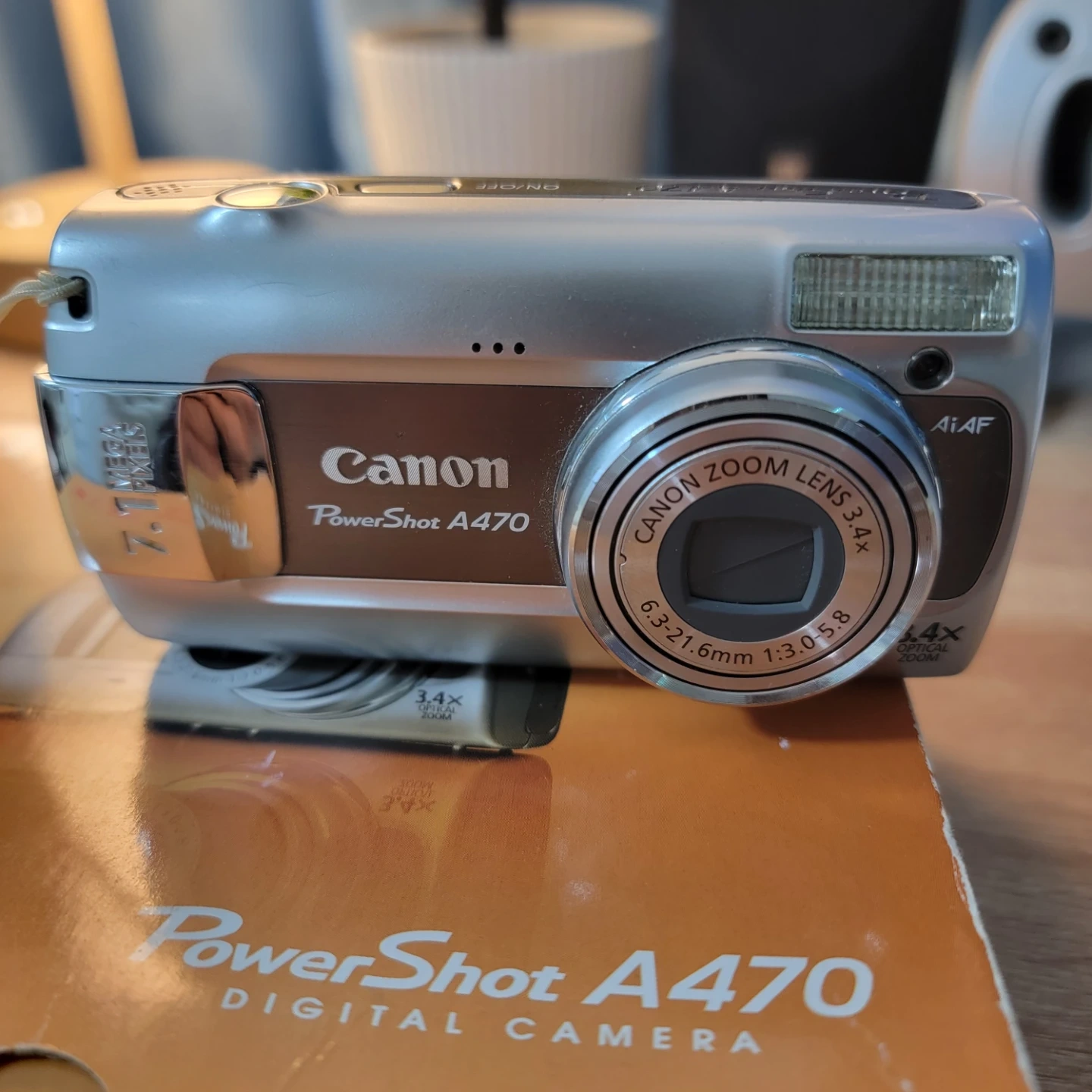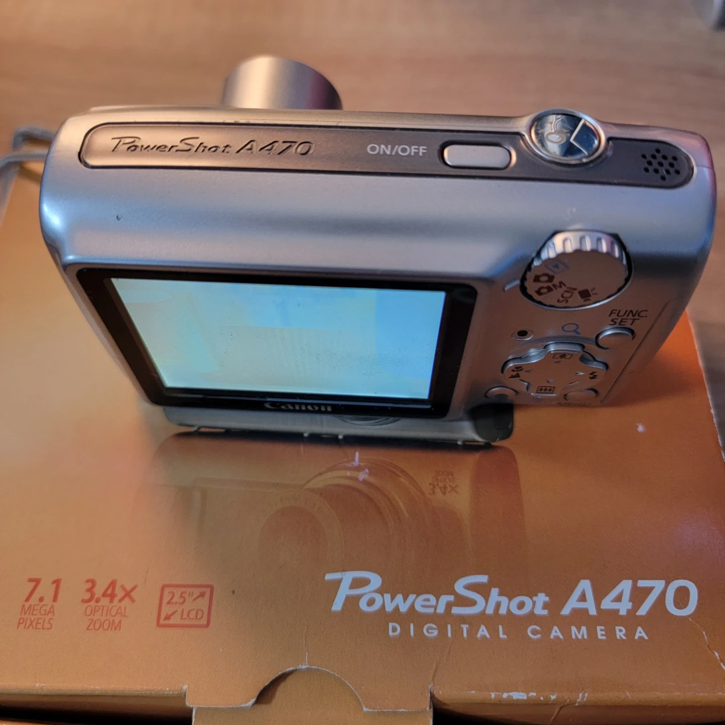 This is a Canon PowerShot A470 digital camera. It features a 7.1 megapixel resolution and 3.4x optical zoom. The camera has a 2.5-inch LCD screen.