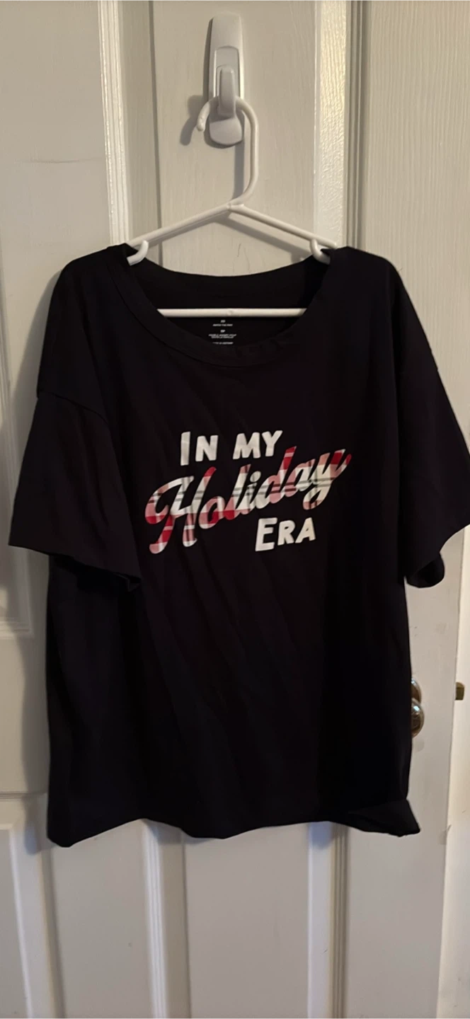 Black t-shirt with "In My Holiday Era" graphic. Material is cotton. Size is medium. This shirt is great for casual wear during the holiday season!