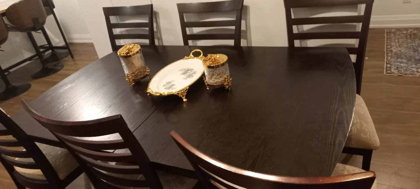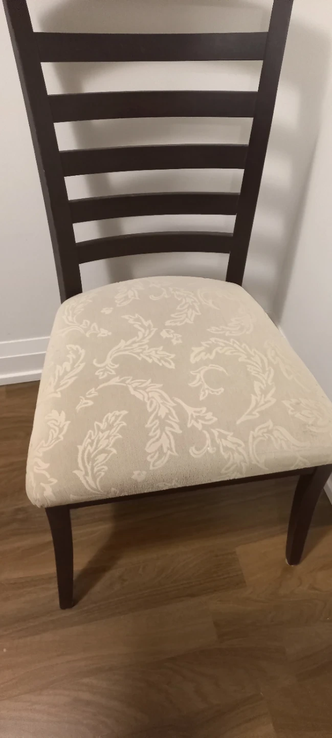 Great quality, dining table with 8 chairs featuring dark wood frames and light-coloured upholstered seats with a subtle floral pattern. The chairs have a ladder-back design and provide comfortable seating. They're perfect for a dining room or kitchen nook.