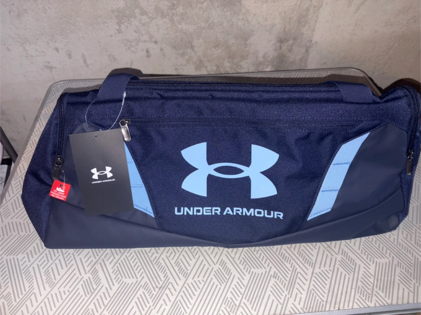 This is a new Under Armour duffel bag. It's a navy blue colour. This bag is useful for gym or travel.