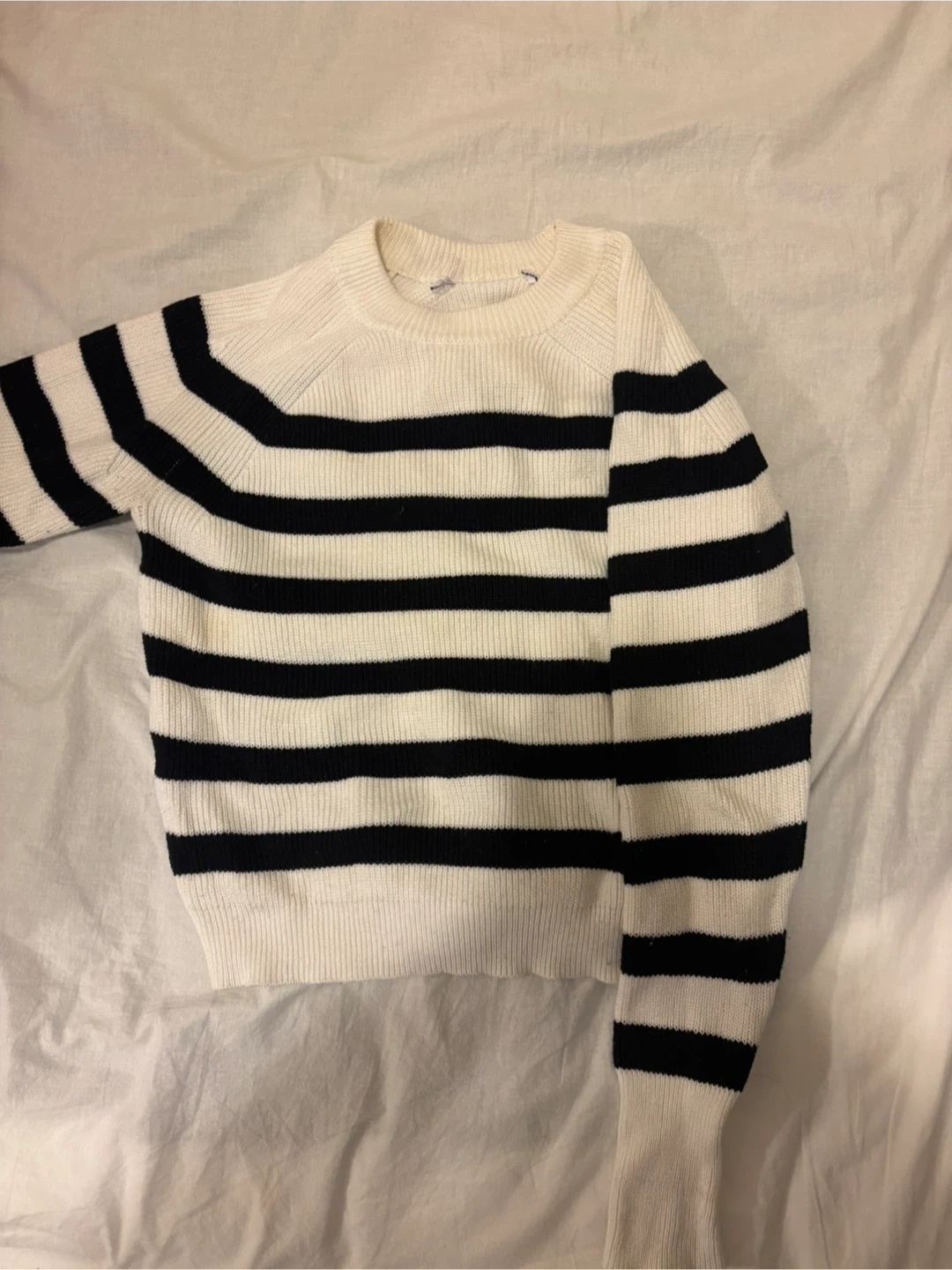 A classic black and white striped crewneck sweater. It's a comfortable knit perfect for layering. This sweater is a size medium but is closer to a S