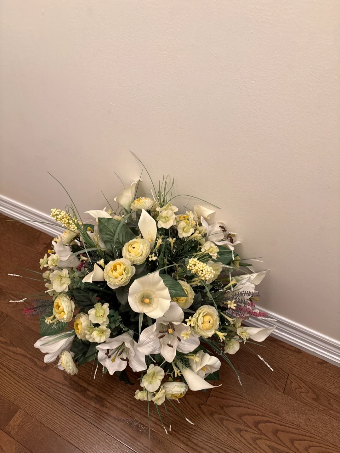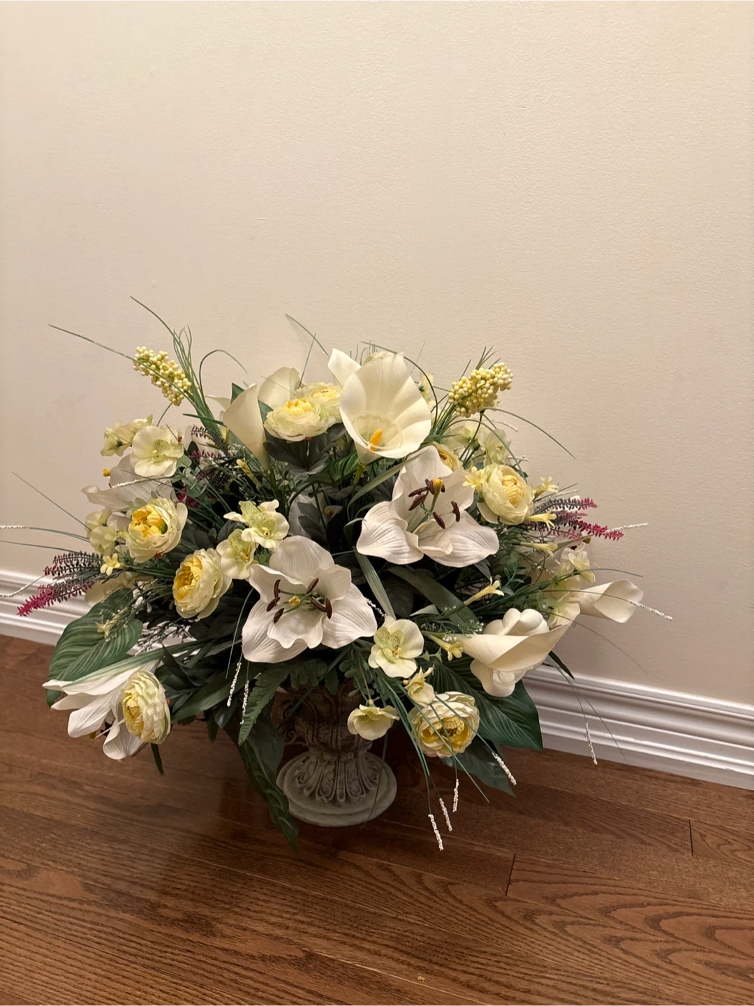 A beautiful floral arrangement featuring white and yellow flowers with greenery, set in a decorative vase. It's in great condition and would look lovely in any room
