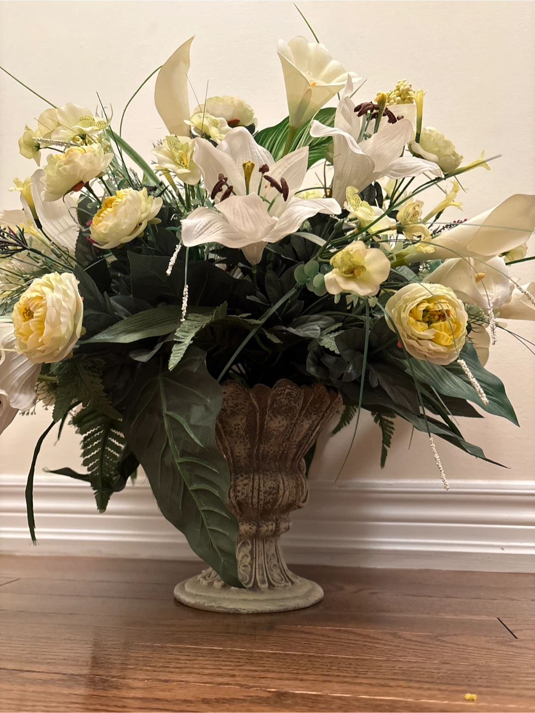 A beautiful floral arrangement featuring white and yellow flowers with greenery, set in a decorative vase. It's in great condition and would look lovely in any room