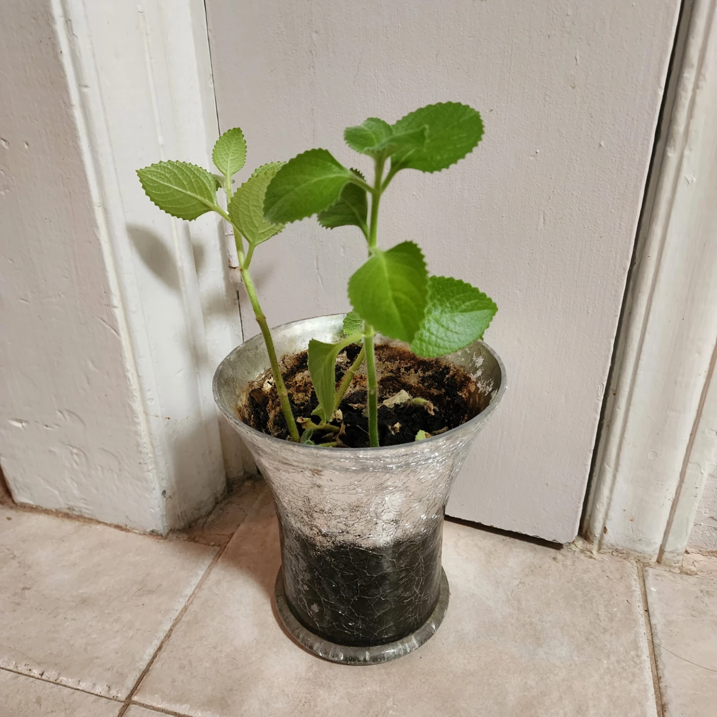Healthy Cuban Oregano plant in a decorative pot. This herb is known for its aromatic leaves, often used in cooking and traditional remedies. The pot has a unique silver cracked-ice finish. Comes in a roughly 6-inch diameter vase.