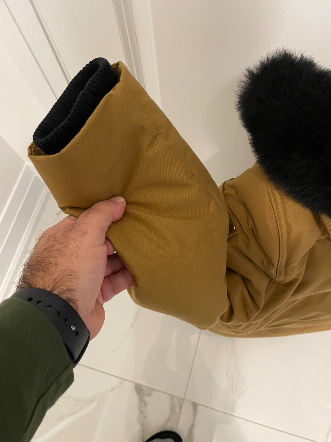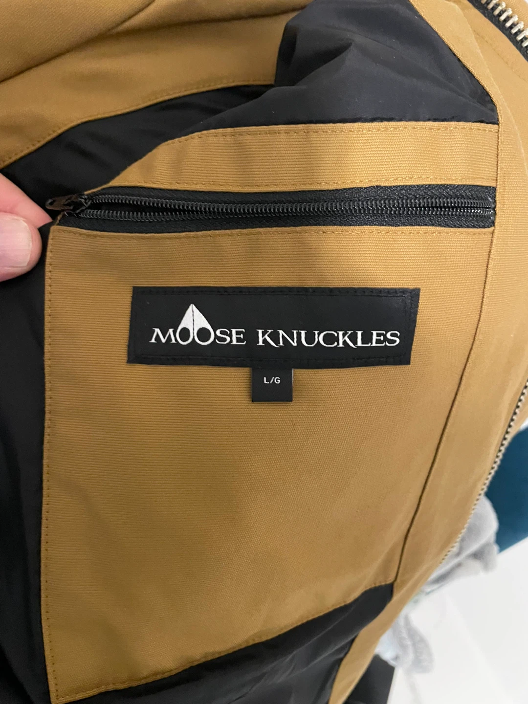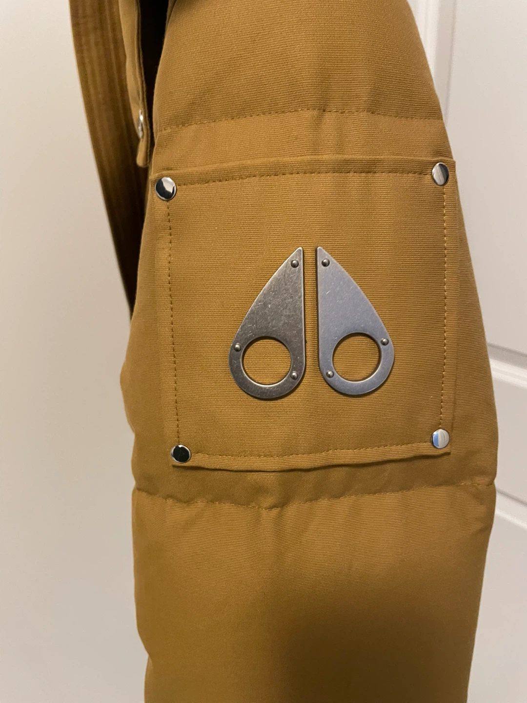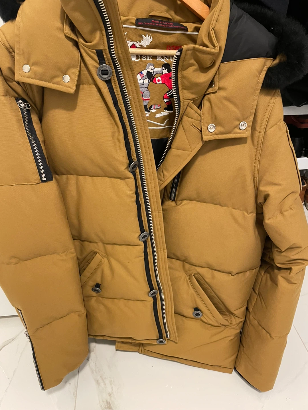 Here's a Moose Knuckles down parka jacket. It's a stylish and warm jacket, perfect for the Canadian winter! The jacket is gold/brown colour with a black fur hood. This jacket has the NFT and you can confirm its authenticity. $650