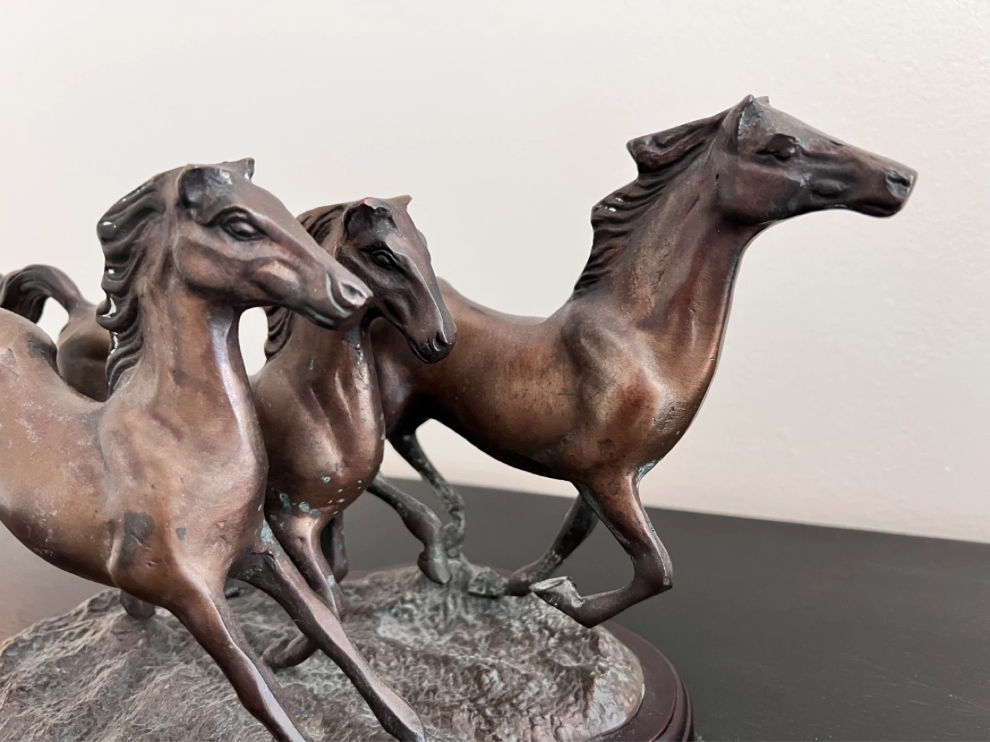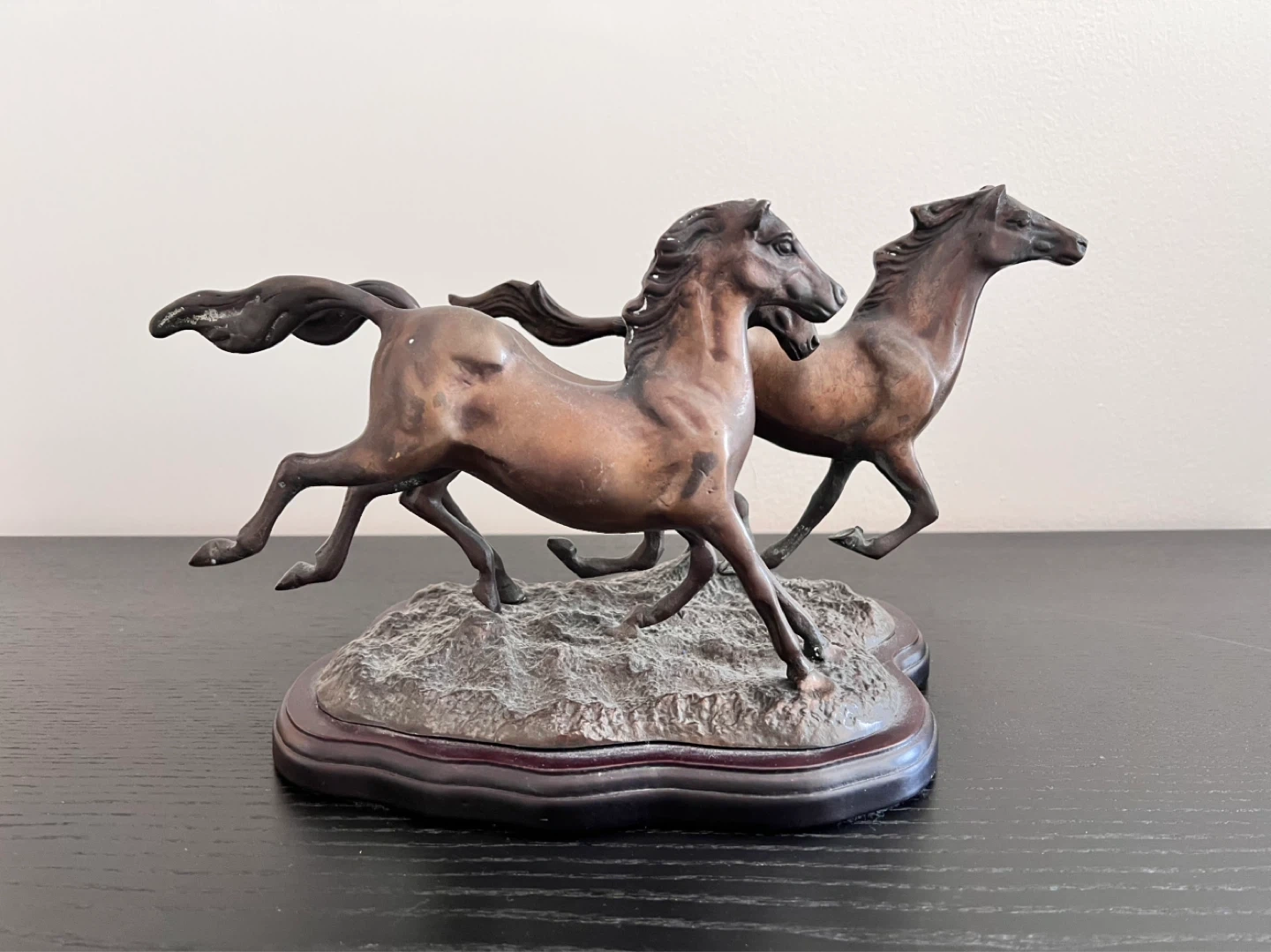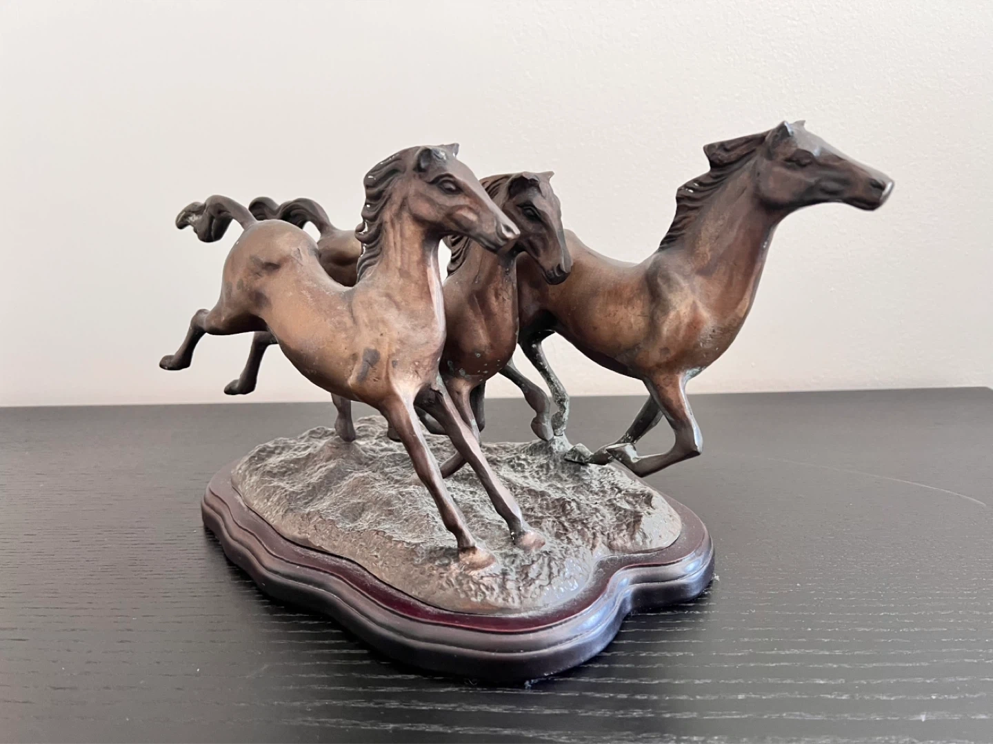 Vintage running horse brass sculpture with bronze patina on wood base. Measures approx 12.5”long x 6.5”wide x 7.75” tall