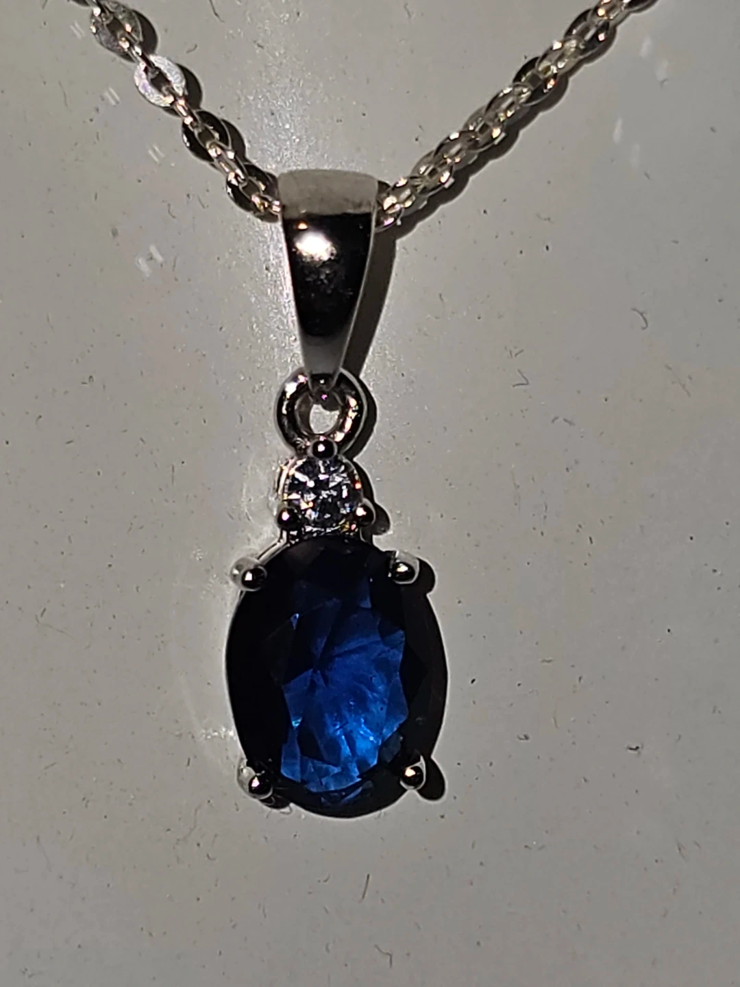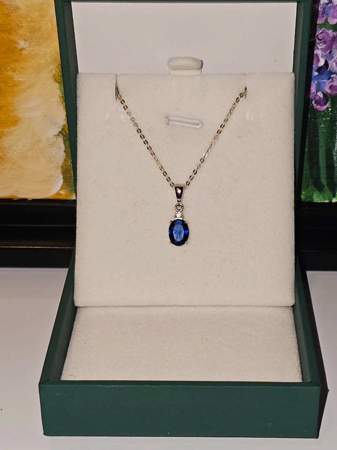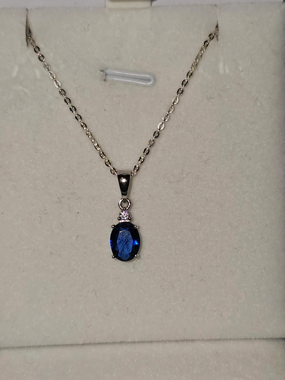 This sterling silver necklace features an oval-cut blue stone pendant with a small clear stone accent. The delicate chain has a secure spring ring clasp. It comes in a presentation box, ready for gifting or safekeeping.