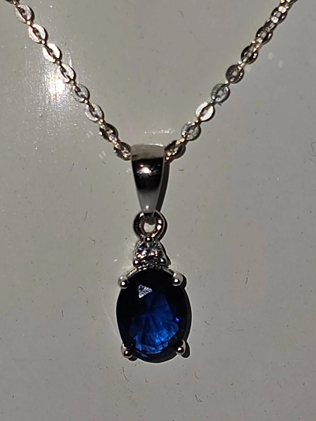 This stunning necklace features a deep blue pendant set in a sleek silver chain. Perfect for adding a touch of elegance to any outfit.