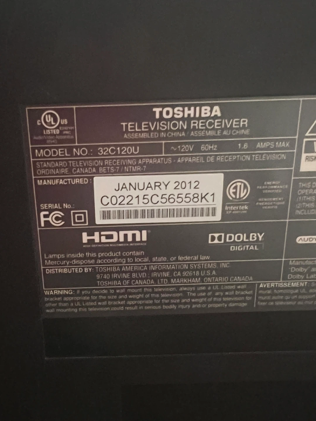This is a Toshiba 32 inch television, model 32C120U. It was manufactured in January 2012. It features HDMI and PC inputs for connectivity. Great for a bedroom or a second display!
