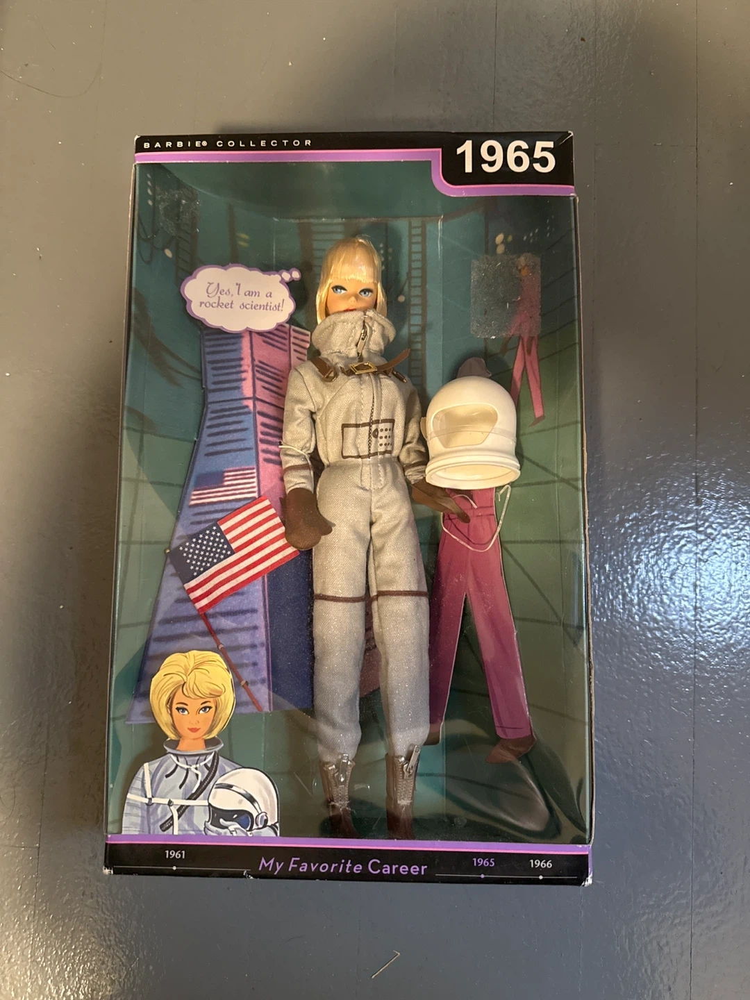 Barbie Collector doll from 1965. Features an astronaut career outfit with a helmet and American flag accessory. This doll is part of the 'My Favorite Career' series.