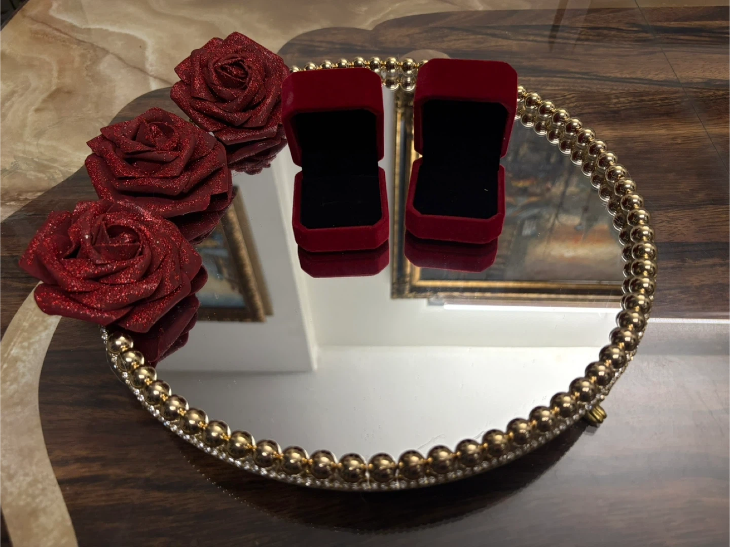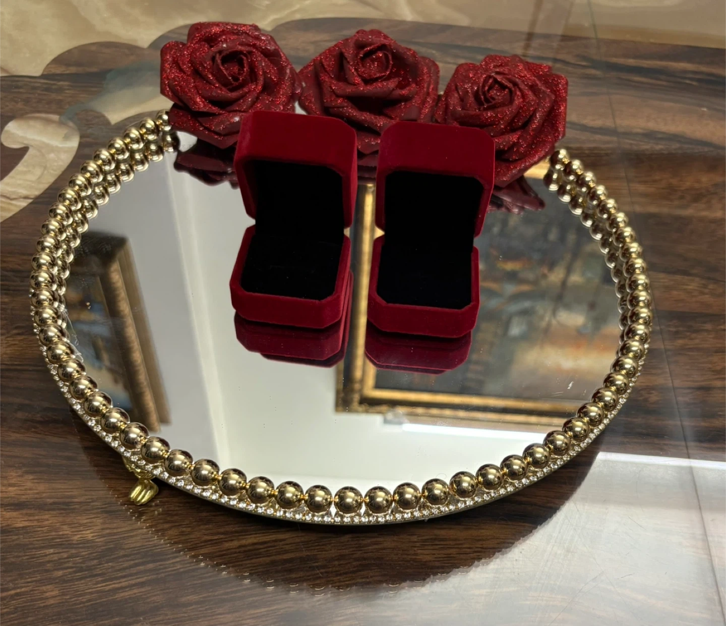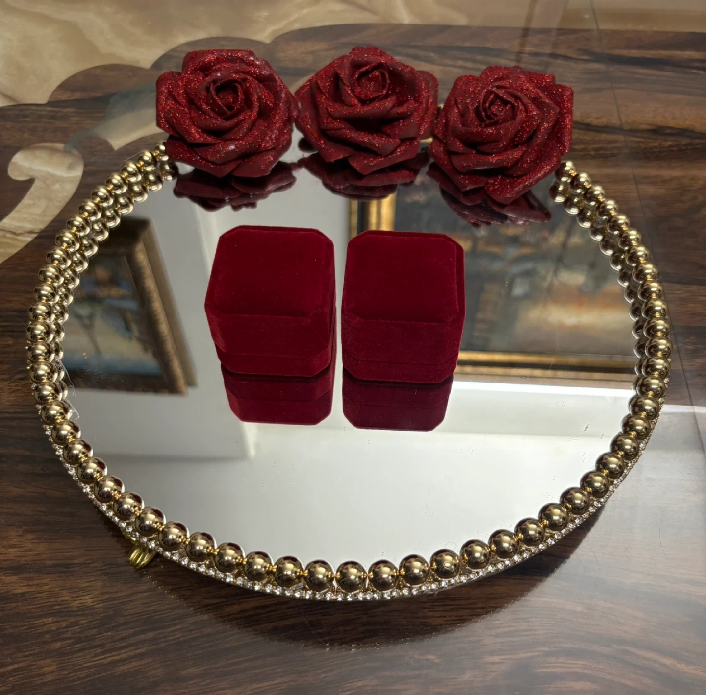 Round Mirror Tray with gold Pearls & gold rhinestone Border