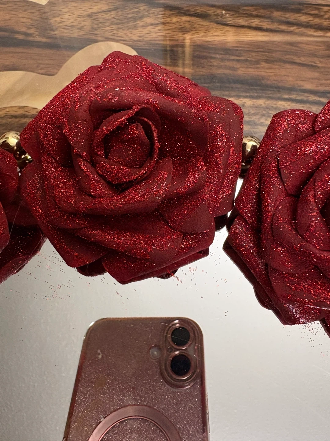 Features a reflective mirrored surface framed by a luxurious border of faux pearls and sparkling rhinestone accents, set on a gold-tone base.