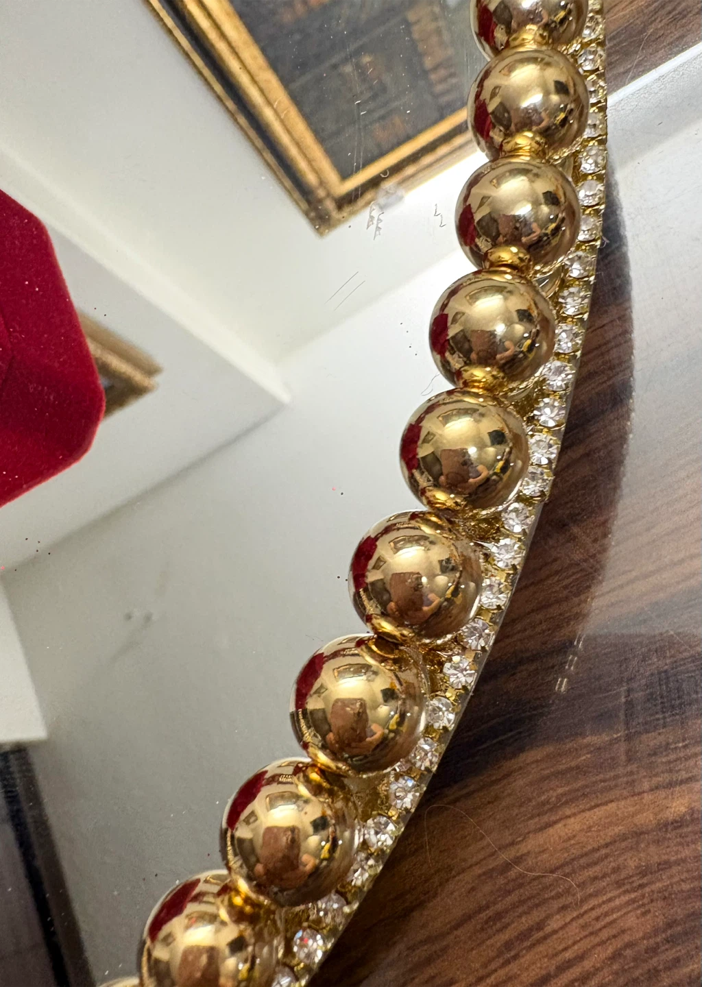 Features a reflective mirrored surface framed by a luxurious border of faux pearls and sparkling rhinestone accents, set on a gold-tone base.