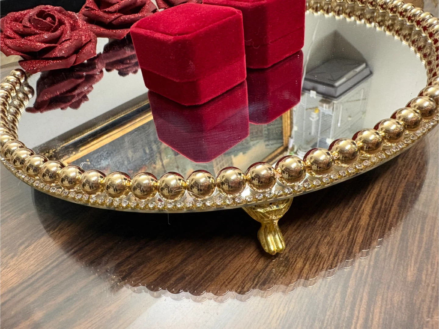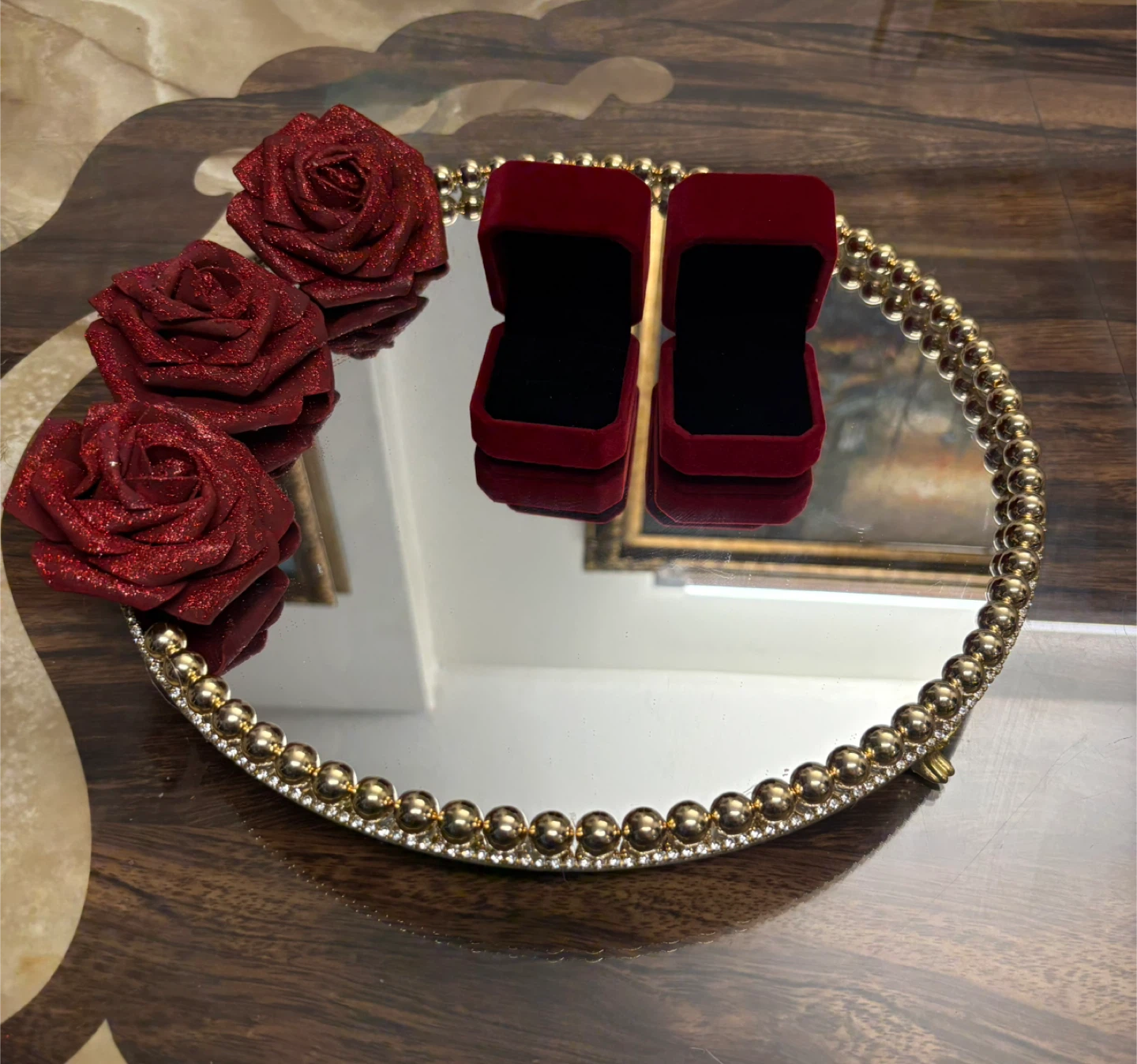 Round Mirror Tray with gold Pearls & gold rhinestone Border