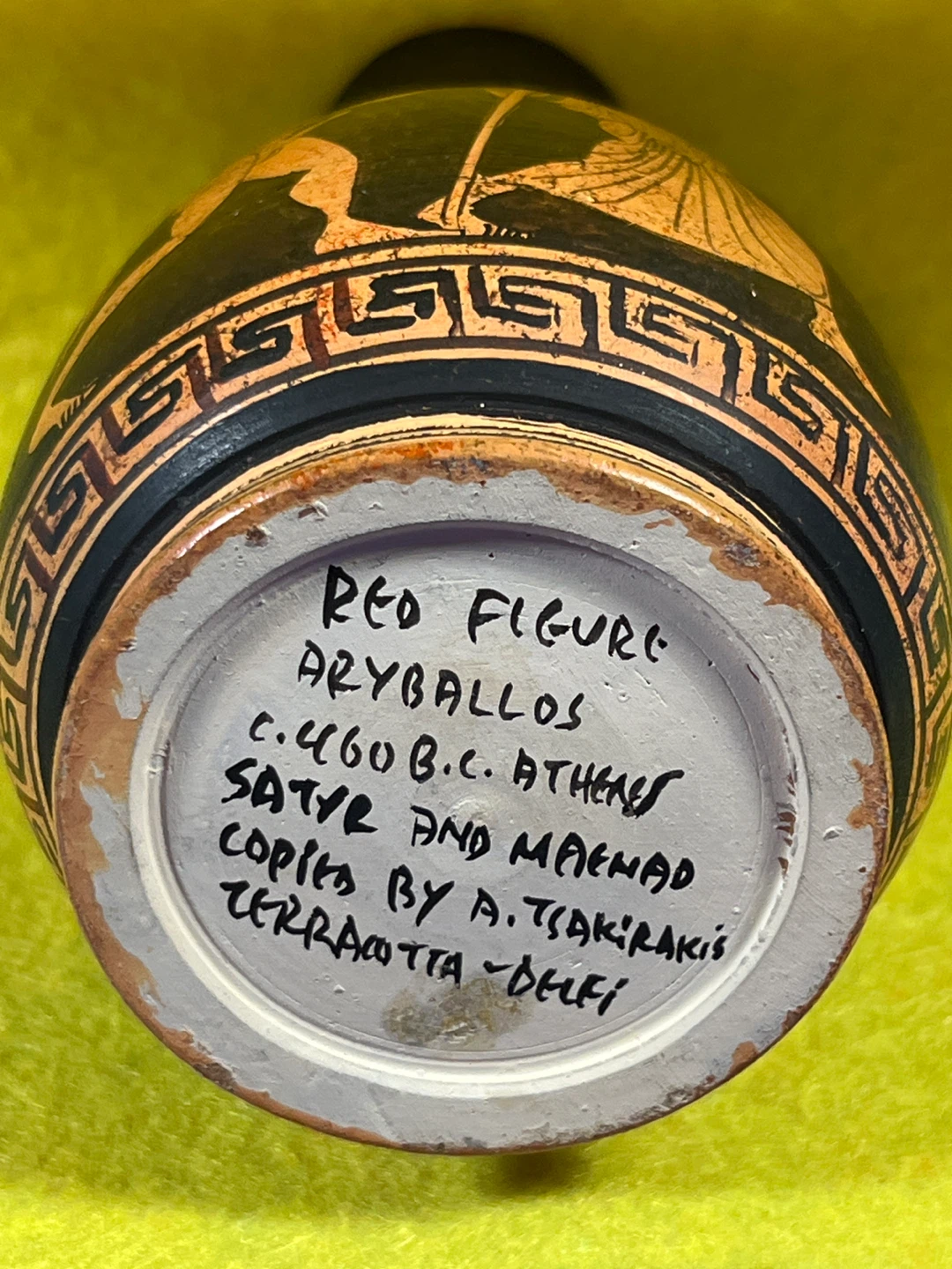 The inscription on the base identifies it as a copy made by A. Tsakirakis in Delfi (Delphi), Greece. It replicates the Athenian style from approximately 460 B.C., featuring a mythological scene with a Satyr and Maenad.