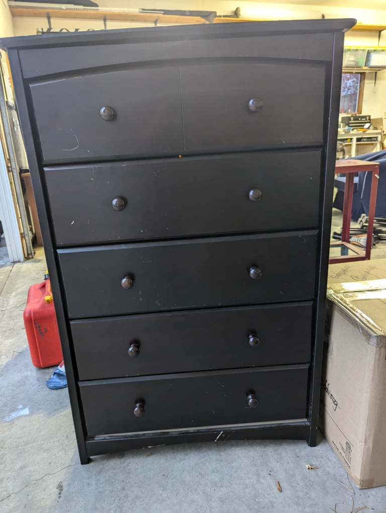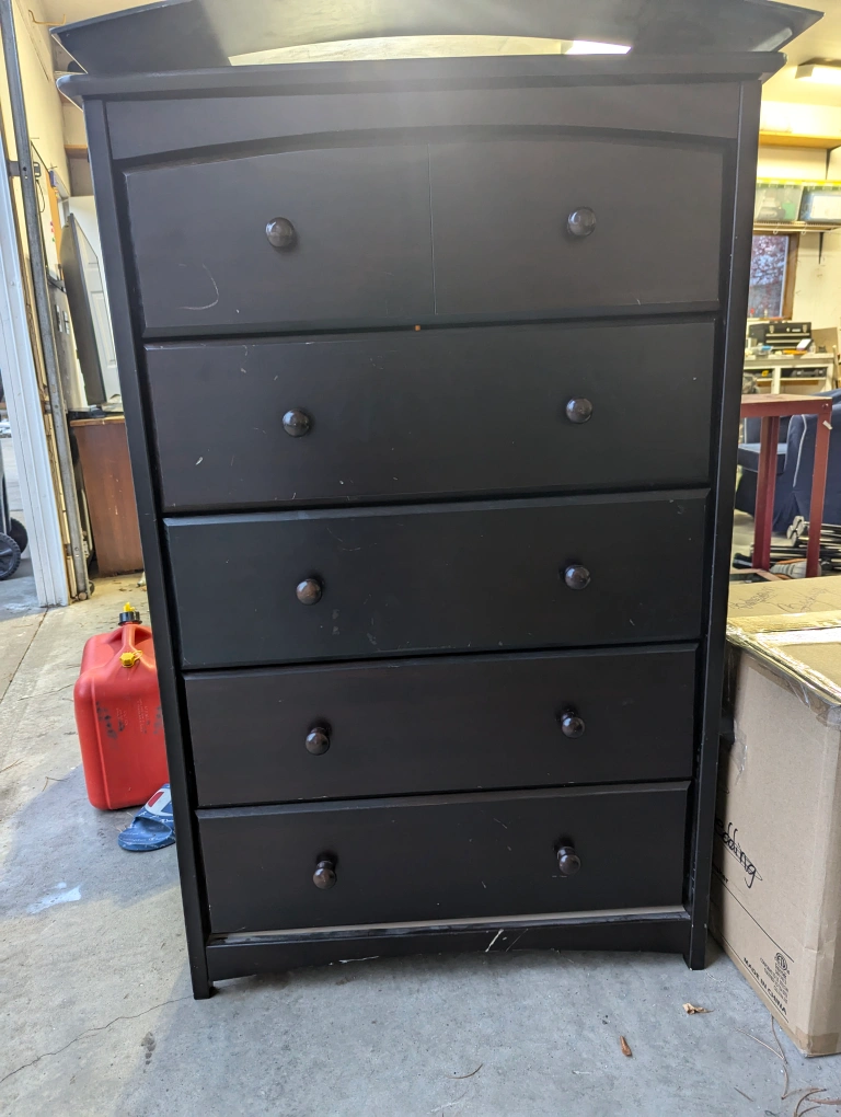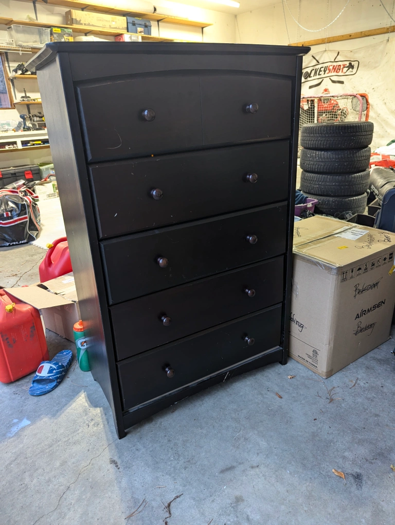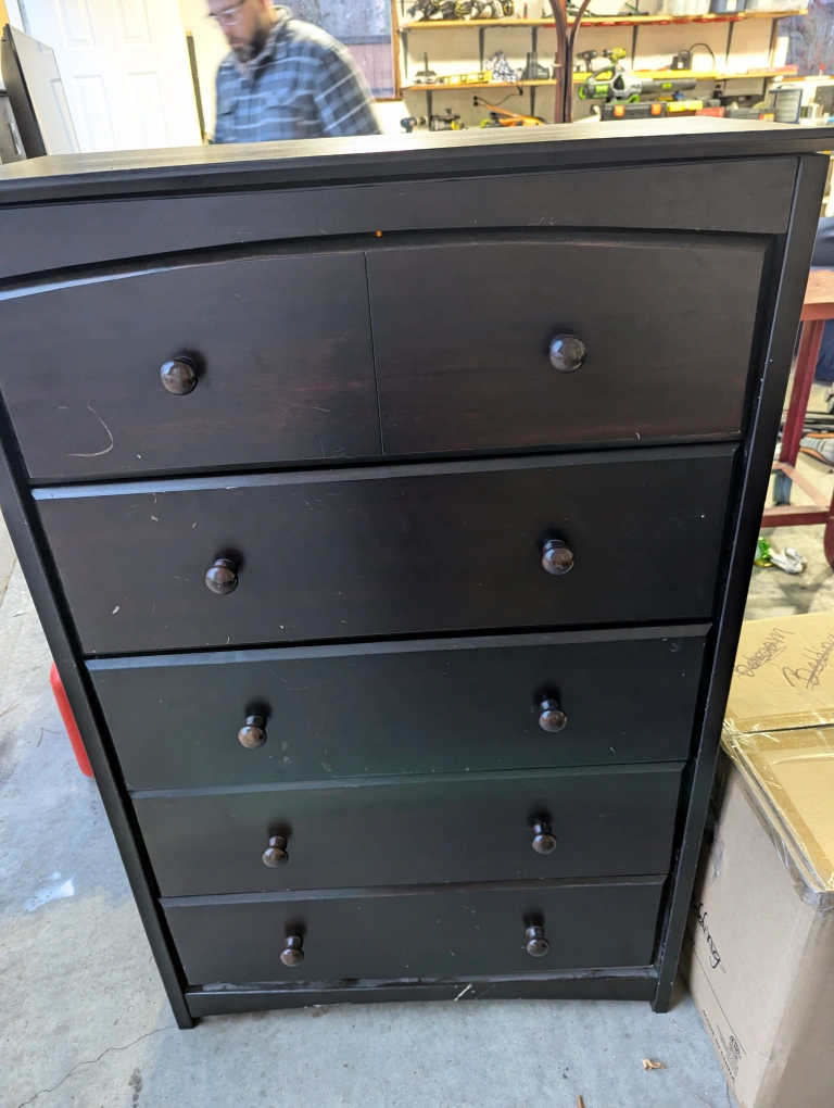 Black dresser with 5 drawers and rounded top. Some wear and tear.