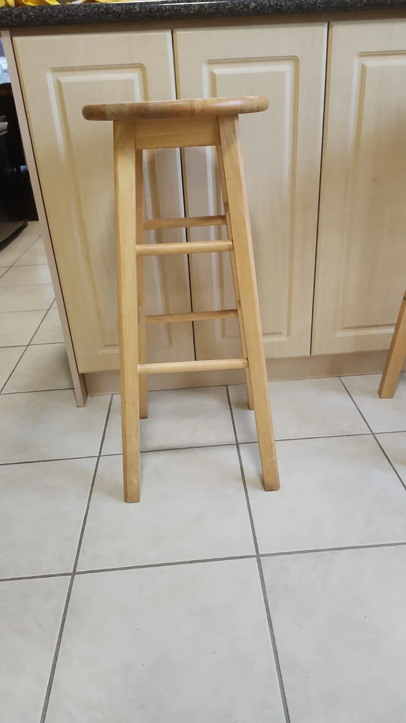 Set of three classic backless bar stools in a natural wood finish. These are sturdy, well-balanced, and feature built-in footrests on all sides for comfort. Perfect for a kitchen island, basement bar, or breakfast nook.