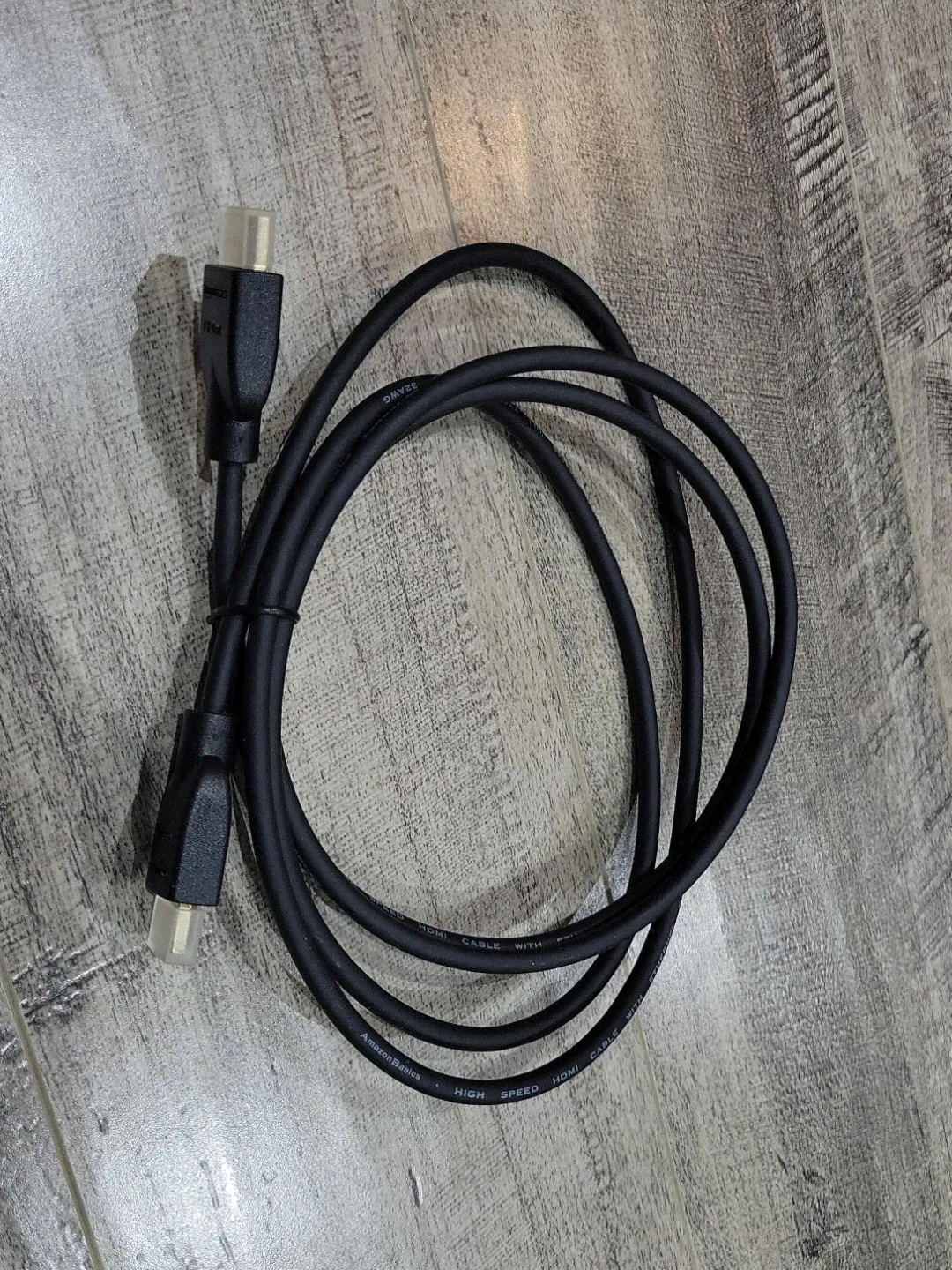 This is an AmazonBasics high-speed HDMI cable. It's 32AWG and includes standard HDMI connectors. This cable's suitable for connecting your devices to a display.