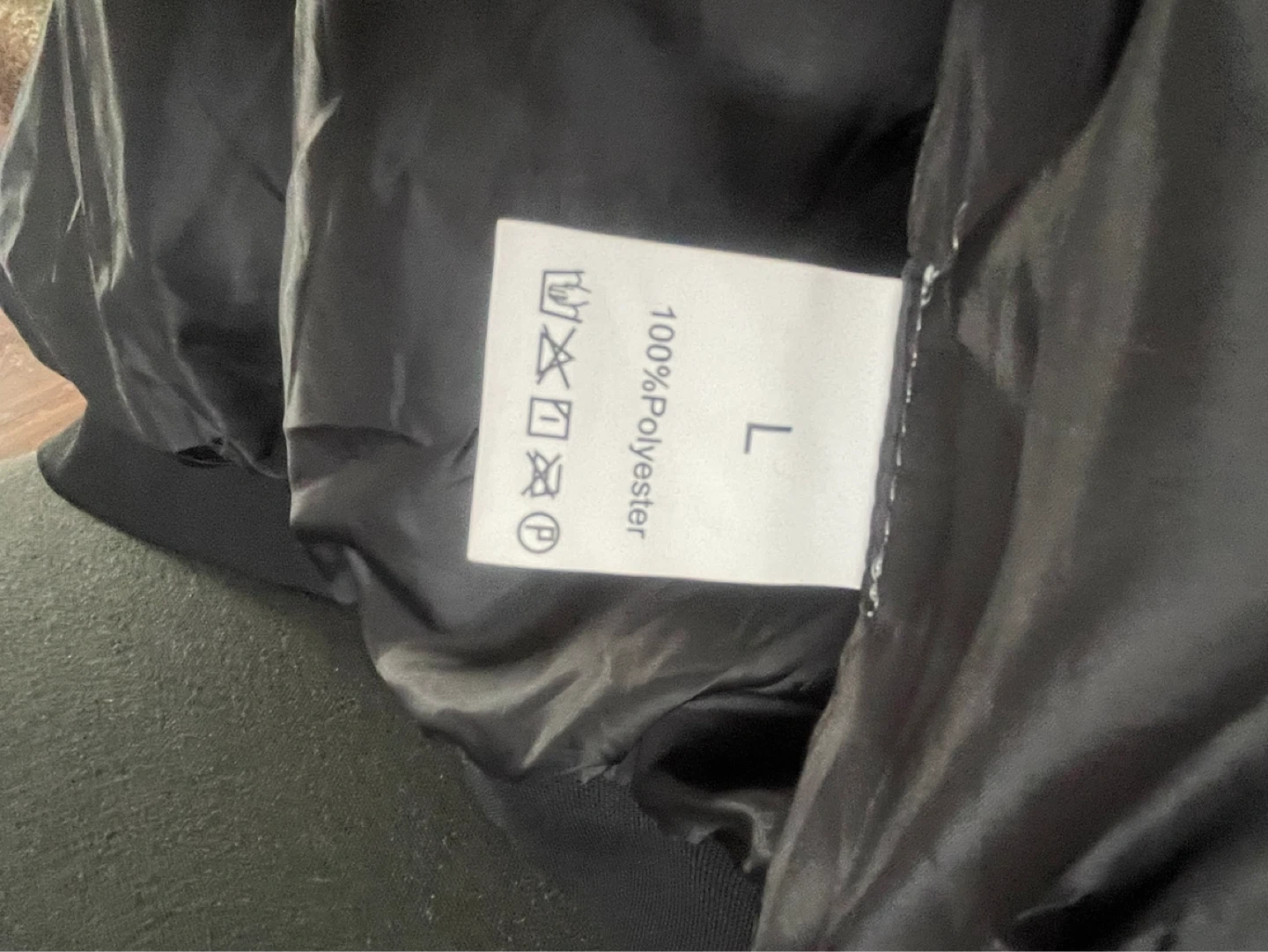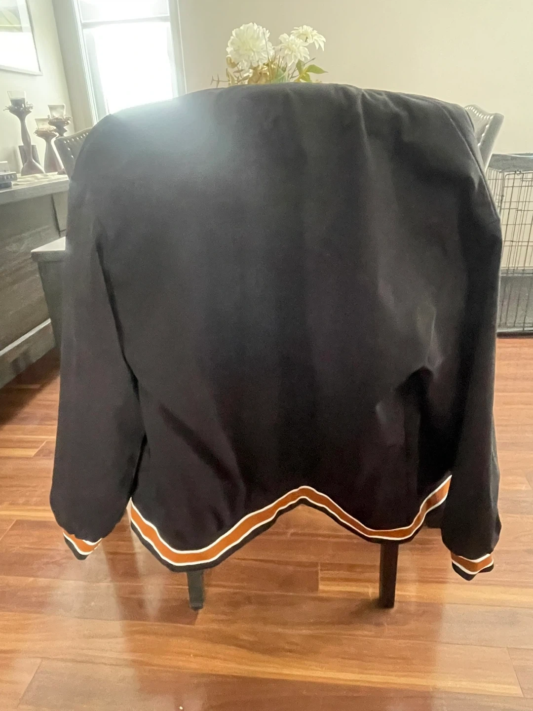 This is a black letterman jacket with an orange hood. It's made of 100% polyester and is size large. This jacket would be great for cooler weather!