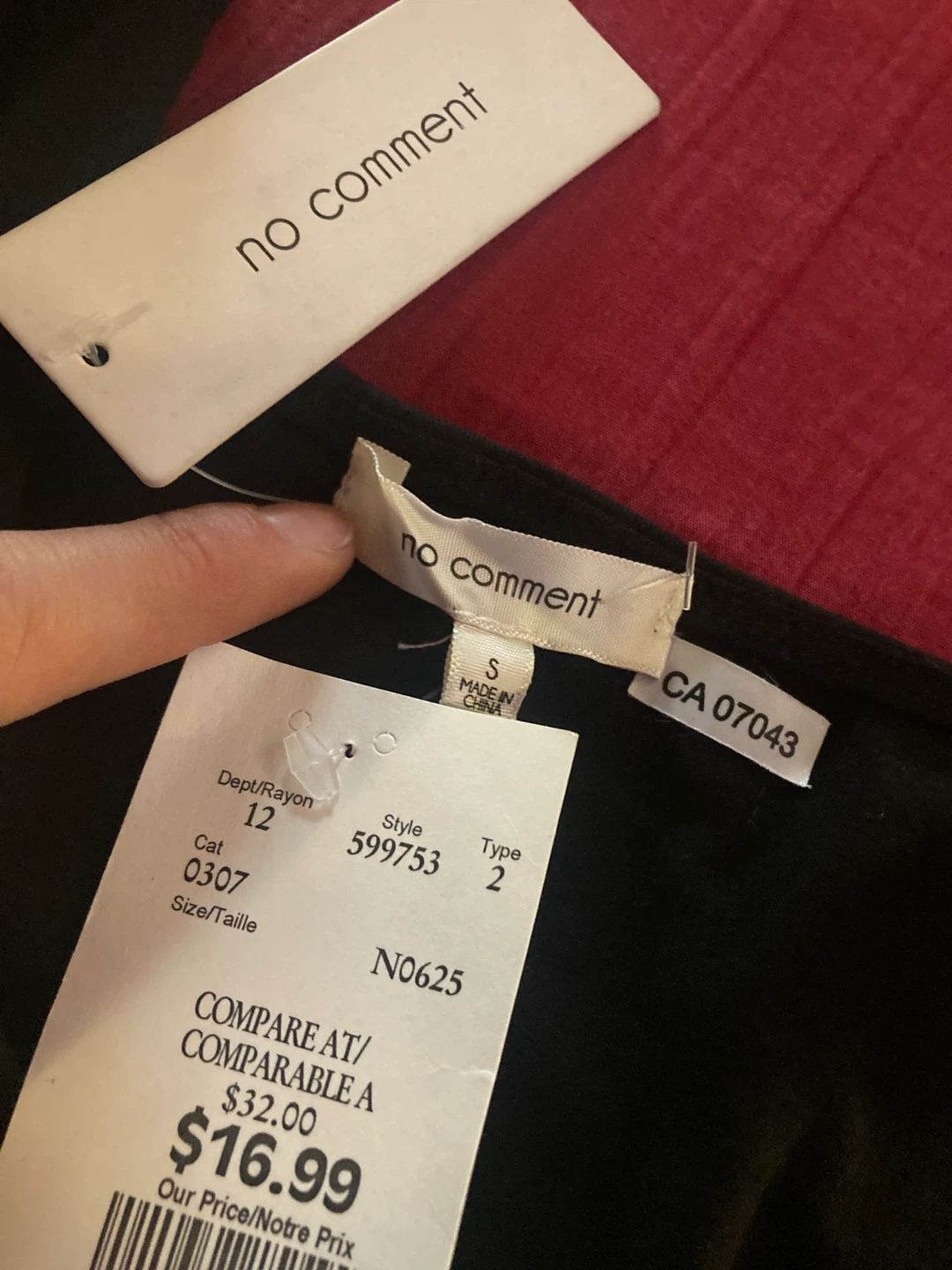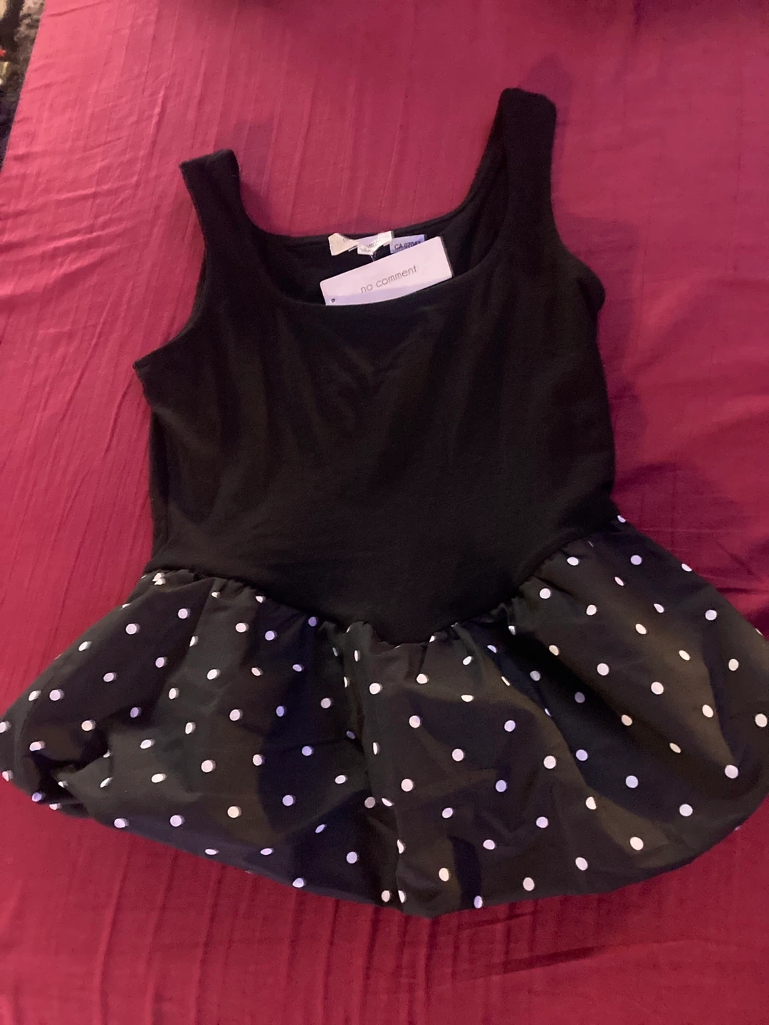 65This is a cute top from No Comment! It's black with a polka dot skirt. The size is S. The material is rayon, tags still on.