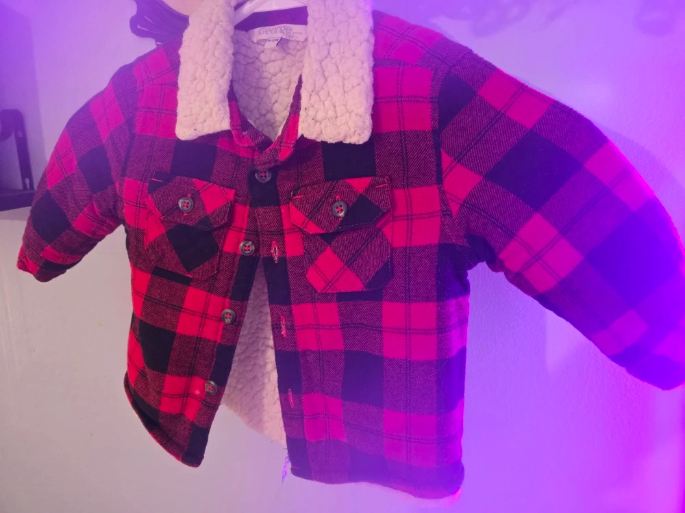 A cozy George brand baby jacket in a red and black plaid pattern! It's sized for 6-12 month olds and features a soft, sherpa-style lining to keep your little one warm and snug