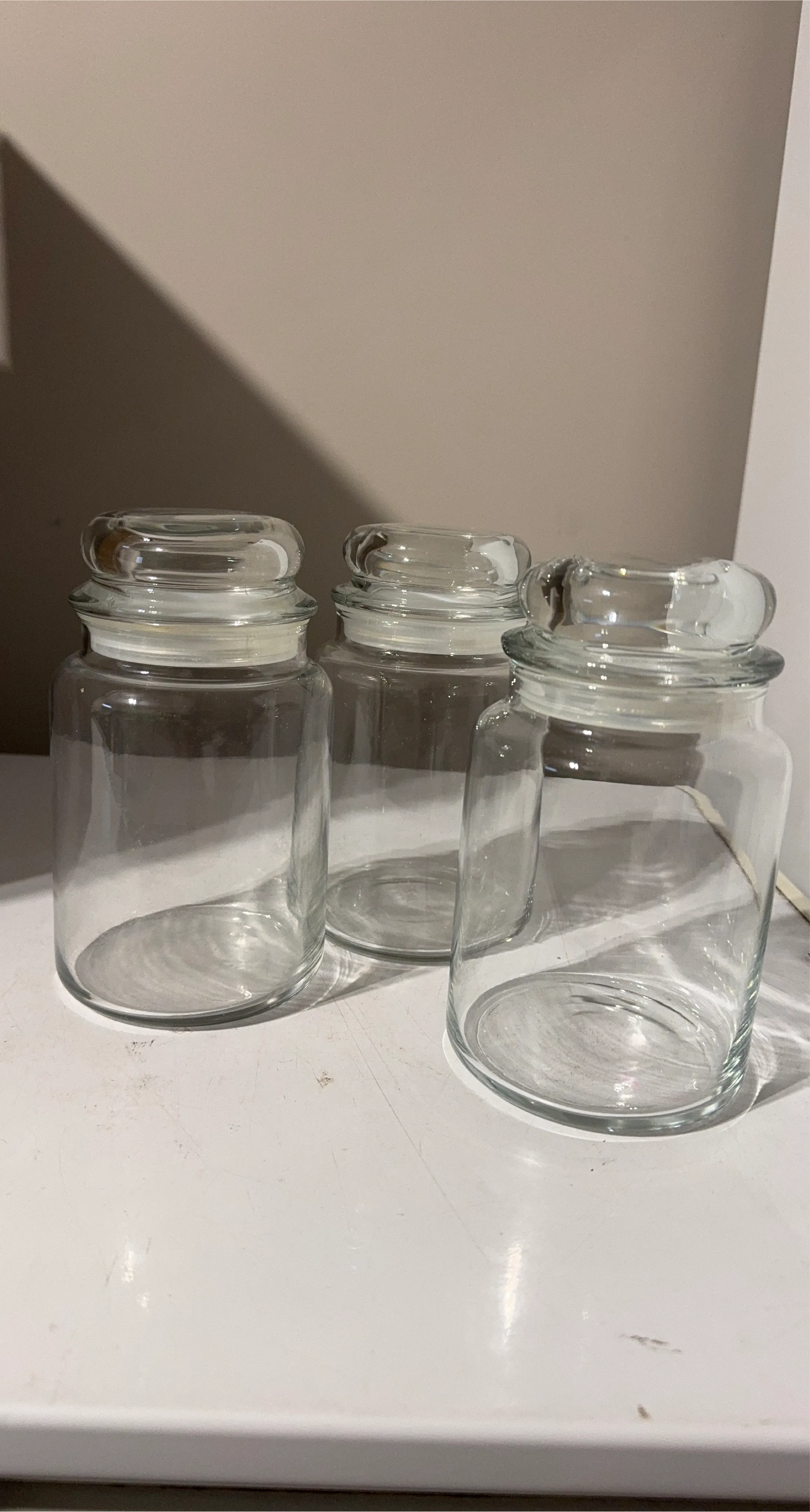 Selling a set of three clear glass jars, each with its own lid. They're perfect for storing anything from pantry staples to craft supplies! They are in great condition and ready for a new home.