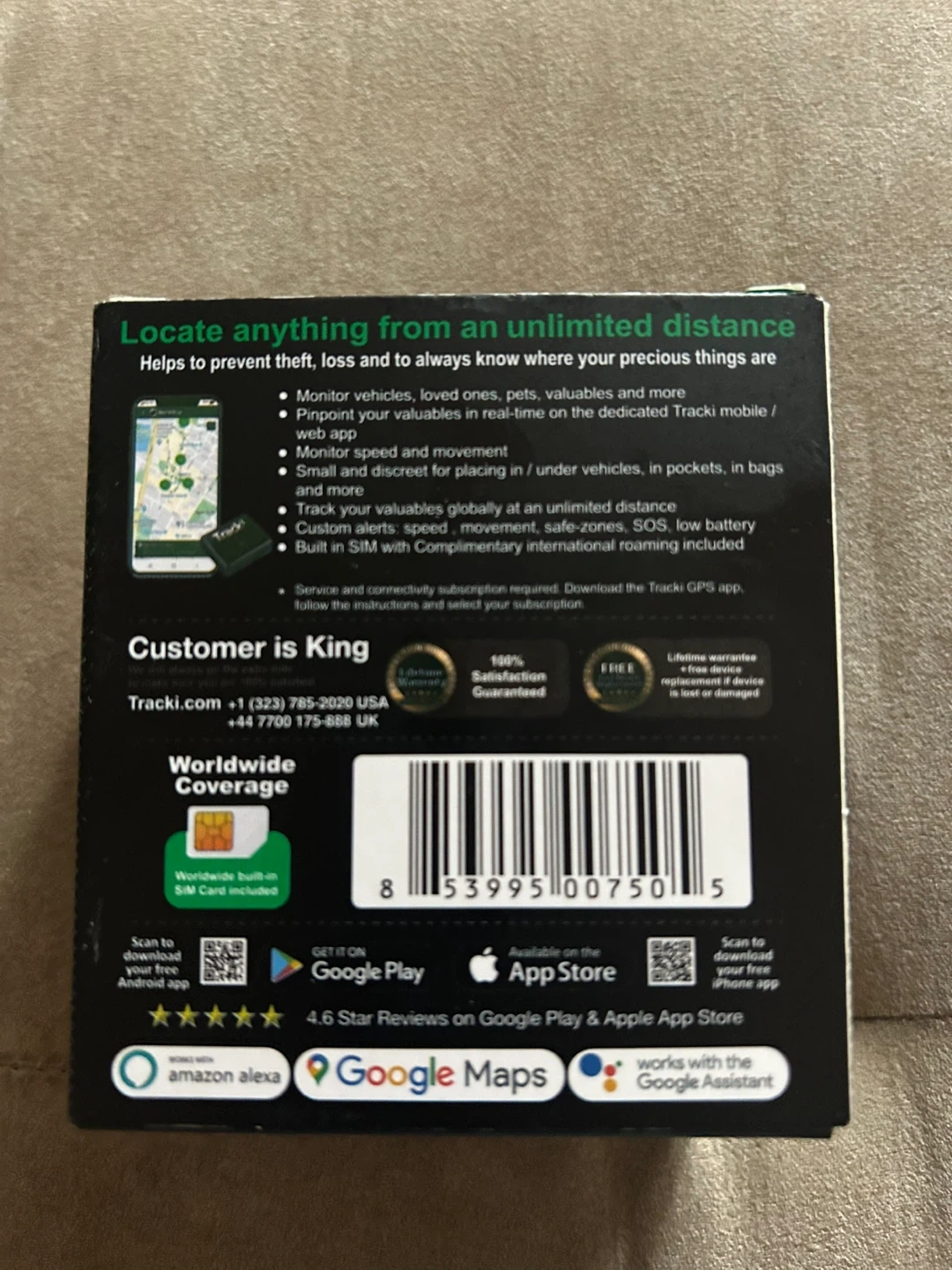 Selling a brand new unopened Tracki Real-Time Global GPS Tracker! It's small and discreet, perfect for keeping track of valuables, loved ones, or vehicles. The tracker works globally at an unlimited distance and includes a built-in SIM with complimentary international roaming. It's designed for easy placement in various locations and offers real-time tracking via the Tracki mobile/web app