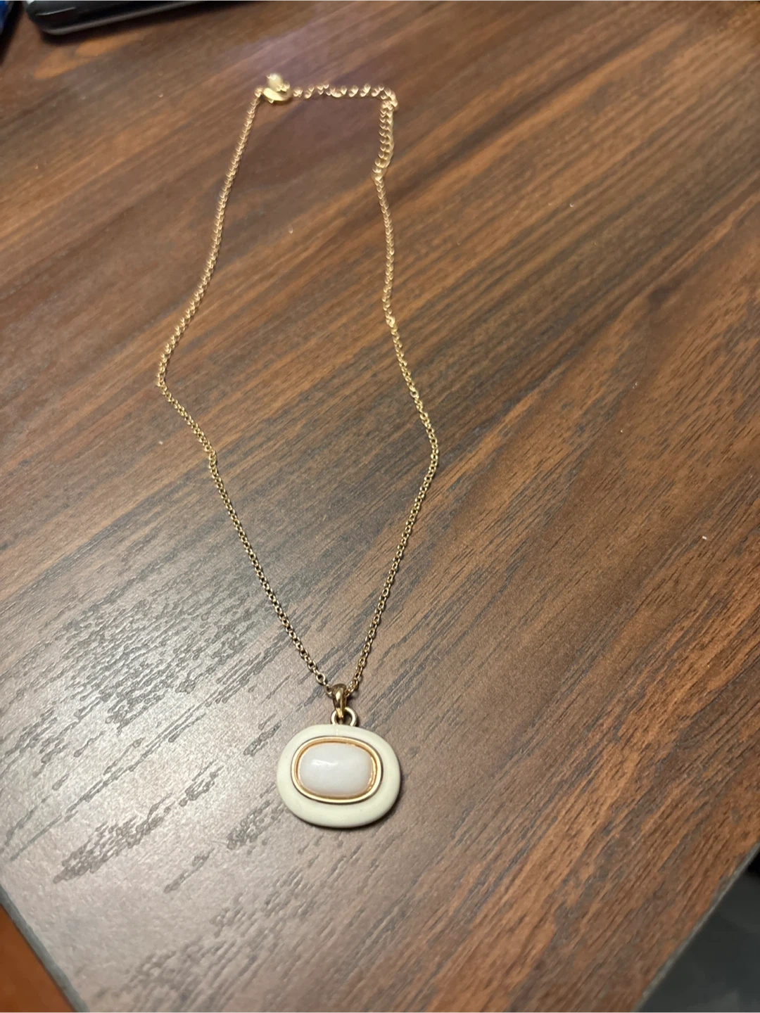 A simple gold tone necklace featuring an oval pendant. The pendant has a cream-coloured outer rim and a light-coloured stone inset. It's a delicate piece that adds a subtle touch of elegance. Comes with pink gift box.