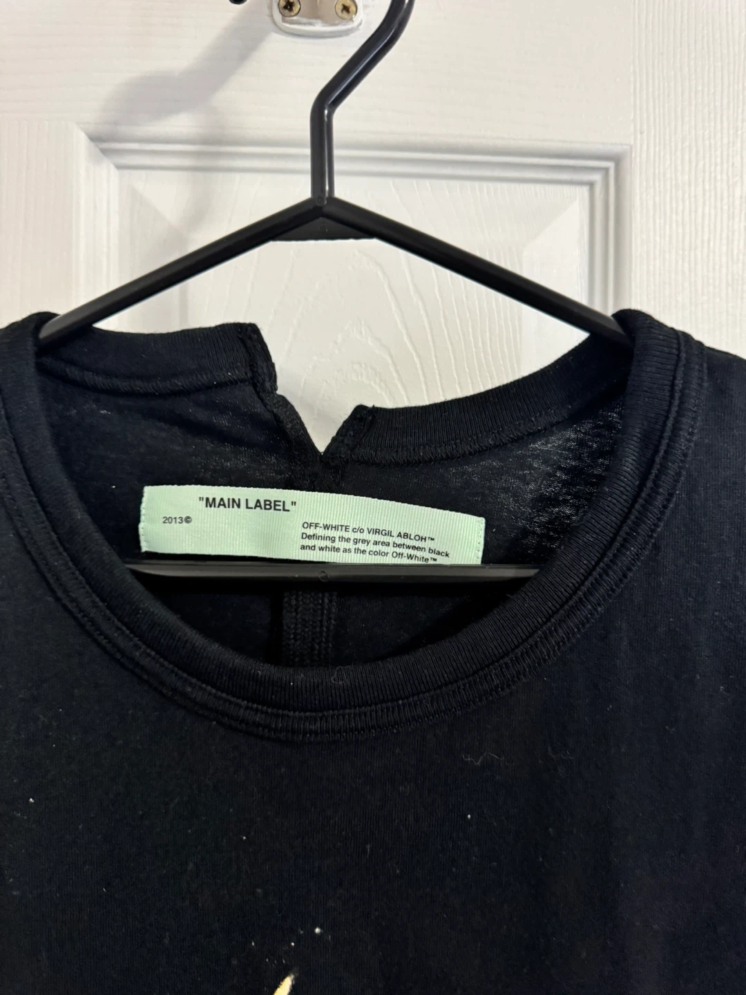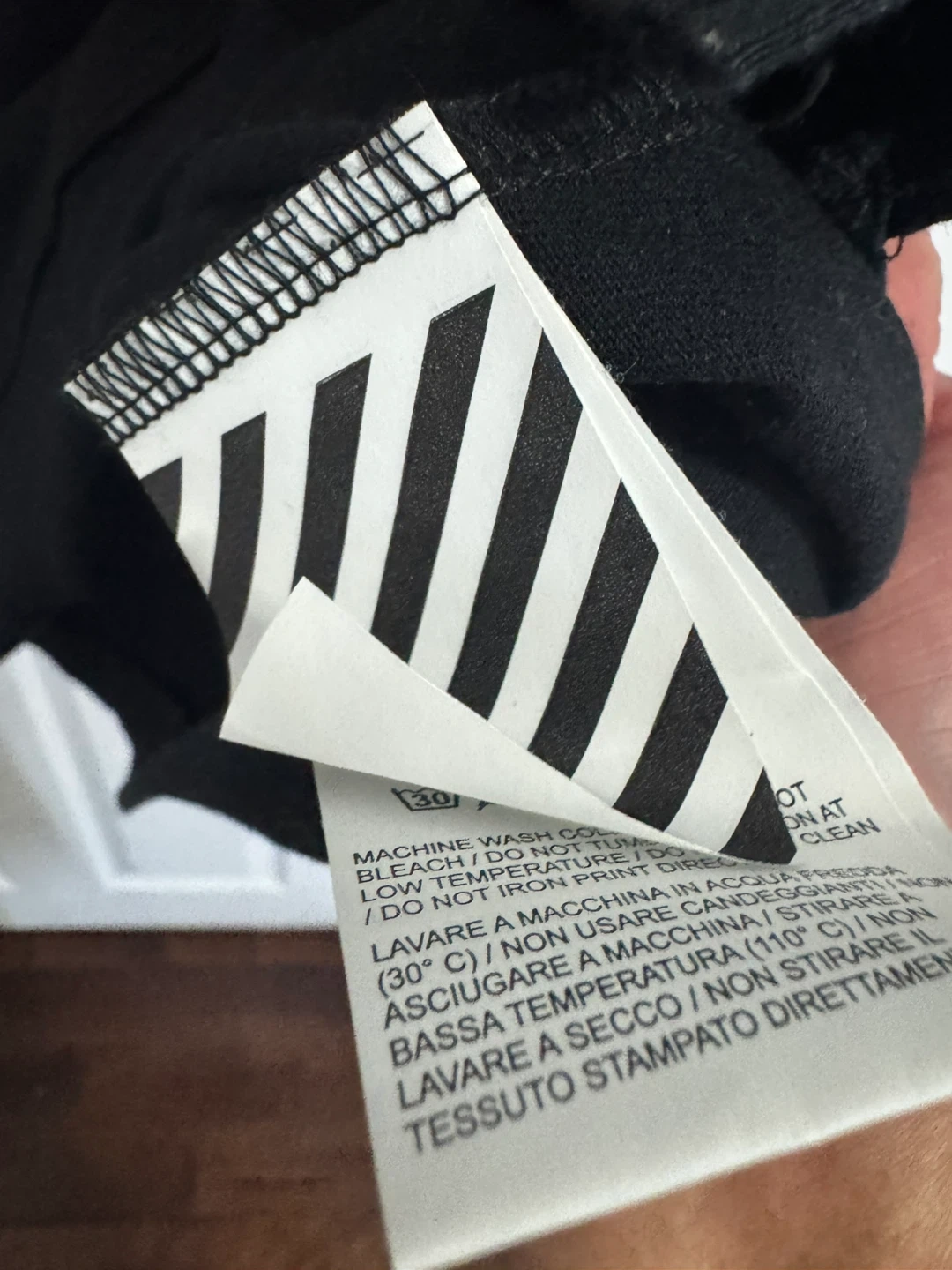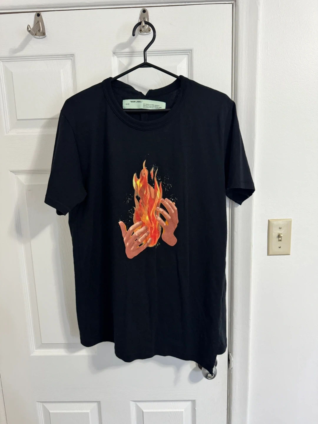 This is an Off-White t-shirt featuring a "Main Label" graphic with flaming hands and diagonal stripes. It's made of cotton. This graphic tee is suitable for casual wear.