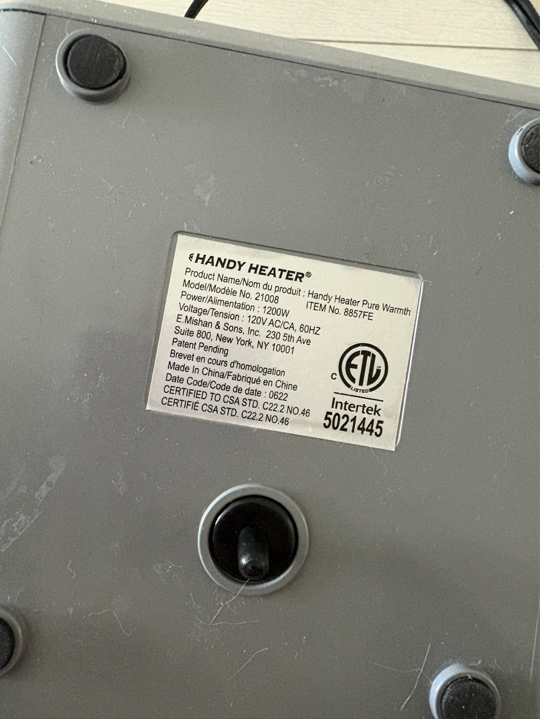 This is a Handy Heater Pure Warmth model 2100B. It's a compact electric heater with 200W power consumption. This heater is useful for providing personal warmth in smaller spaces.