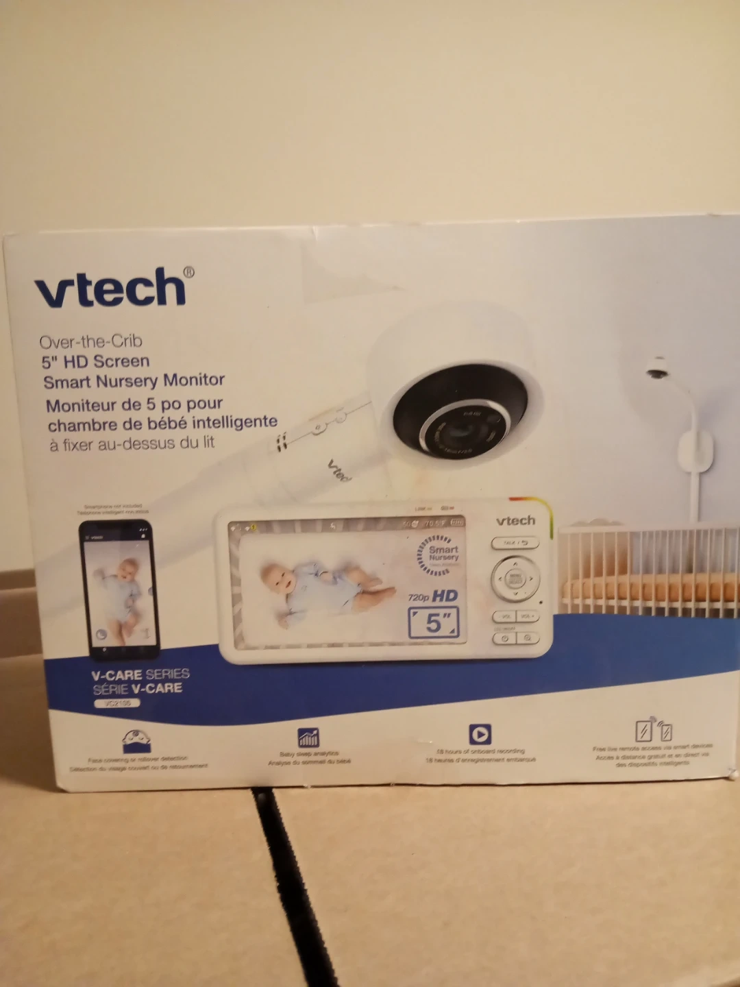 This VTech Smart Nursery Monitor features a 5" HD screen for clear viewing. It's designed for over-the-crib placement. The monitor offers 720p HD video resolution and 18 hours of onboard recording.