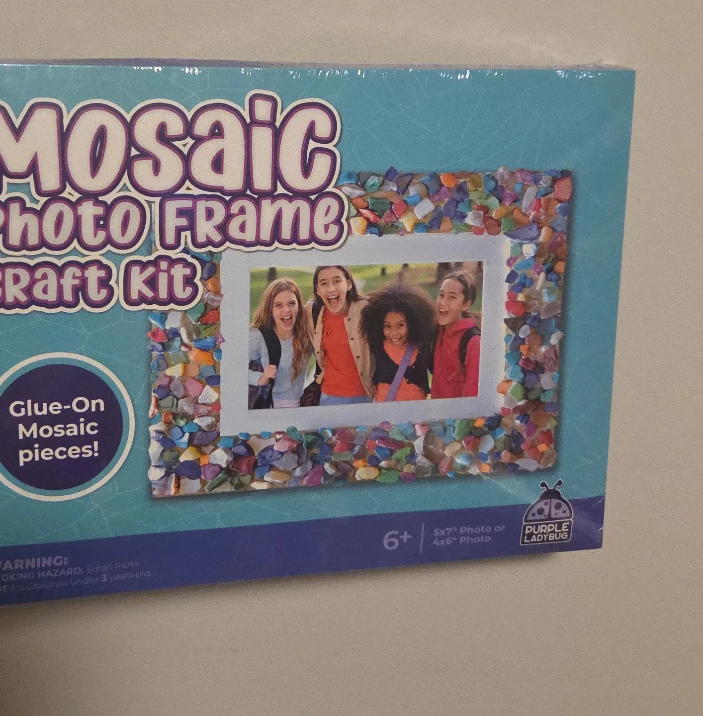 This is a Mosaic Photo Frame Craft Kit from Purple Ladybug. It includes glue-on mosaic pieces for decorating. Designed for photos that are 5x7" or 4x6".