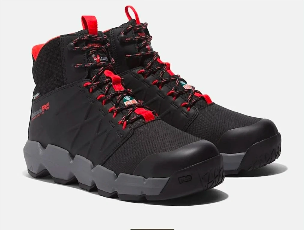 Black and red Timberland Pro work boots. These boots feature a durable construction suitable for demanding work environments. Steel toe protection and anti-fatigue technology are included.