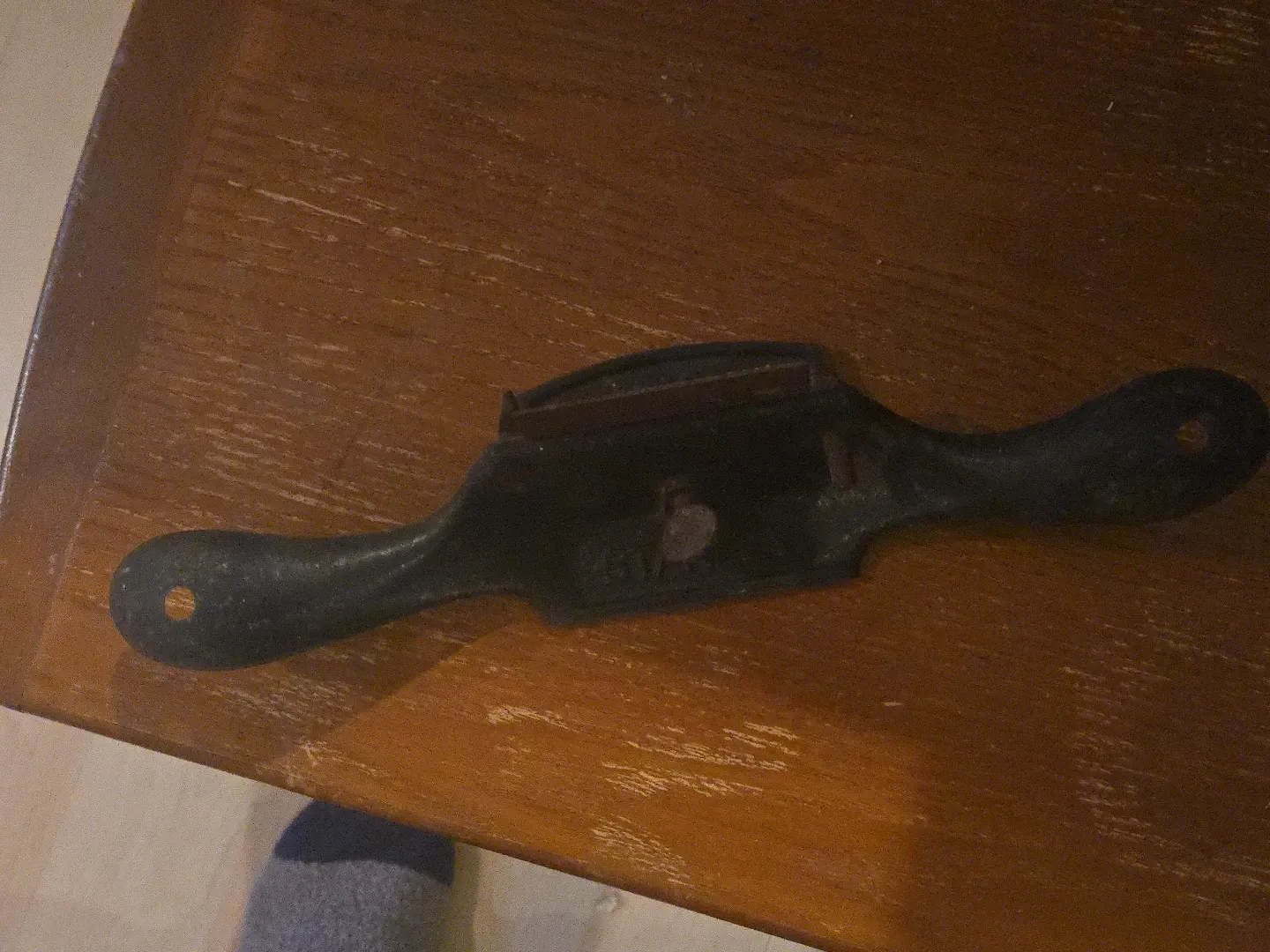 This is a vintage drawknife spokeshave tool. It appears to be made of cast iron with a steel blade. The tool has two handles for grip. It's suitable for shaping wood.