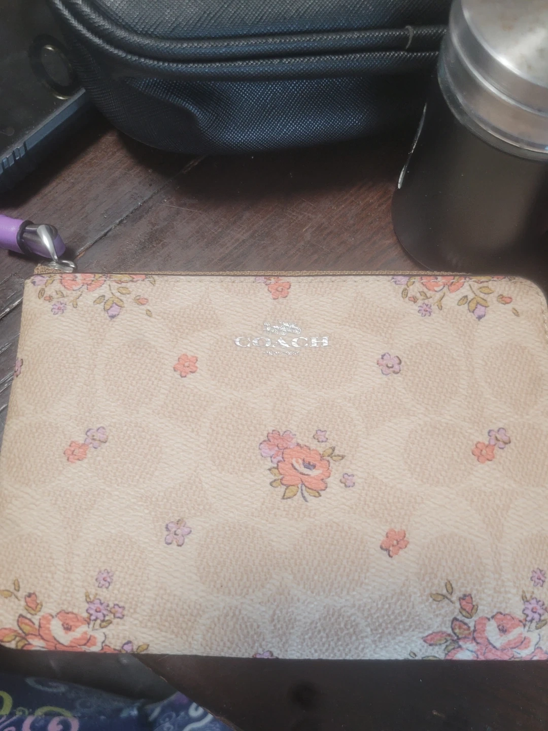 A Coach wristlet with a classic beige background and a charming floral print. It has a handy wrist strap for easy carrying. Great for keeping essentials organized on the go! Dm me for location cash or etransfer only pick up only