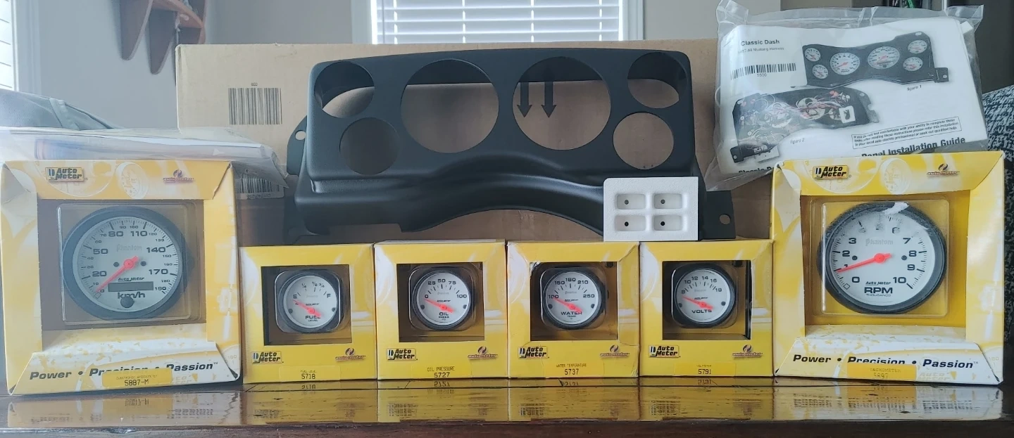 Complete pkg comes with oil pressure & water temp sending units. Turn signal, high beam and parking brake indicator. Led Kit. Plug & play gauge wiring harness. 3-3/8" speedometer, 3 3/8 tachometer, 4 2 1/16 fuel level gauge, oil pressure gauge, water temp, volt gauge. Matte black dash. The speedometers is NOT included in thr complete pkg & must be purchased separately. If needed i do have a new speedometer sending unit for sale.