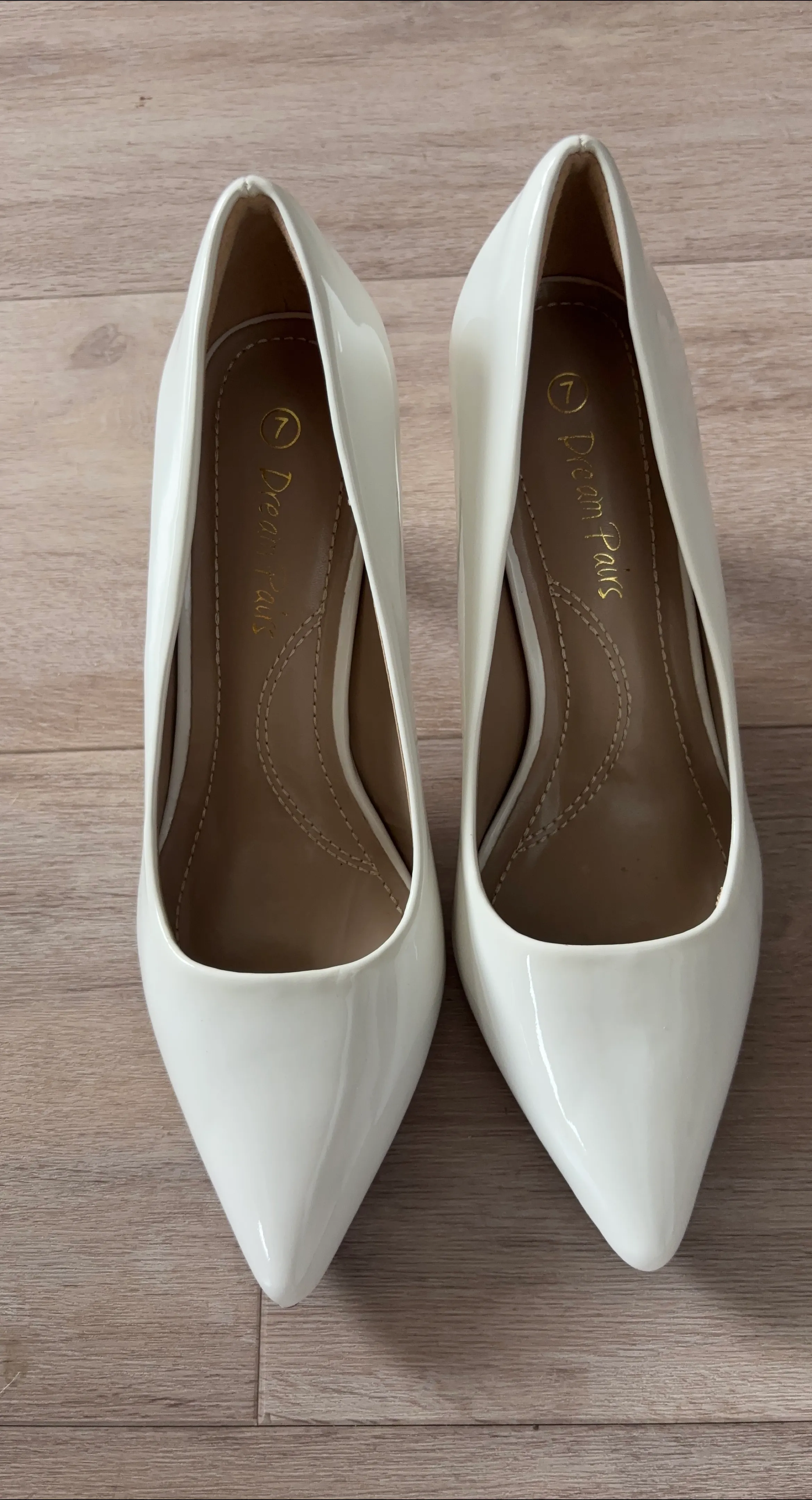 Selling a pair of Dream Pairs white heels in size 7. They're in great condition and ready for a new home! They have a minor scratch in the heels.