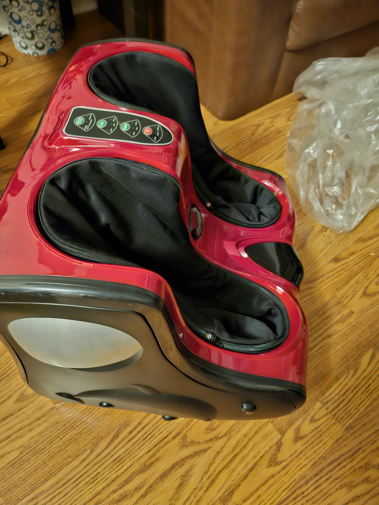 New red foot massager. Features multiple settings and heat function. Includes power cord and instruction manual. Excellent condition.