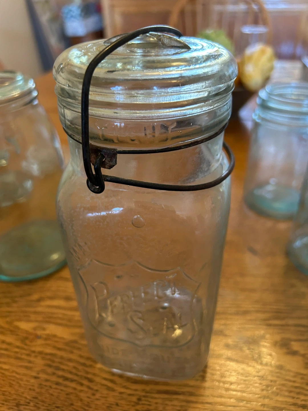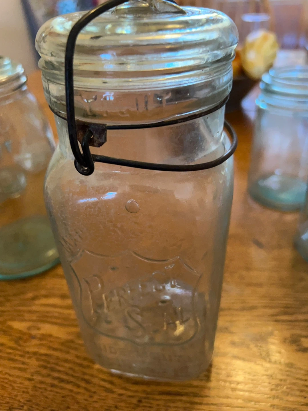Selling an antique glass jar with a 'Perfect Seal' embossed design! It has a wire bail closure and a glass lid. It's a unique piece for collectors or anyone who loves vintage kitchenware