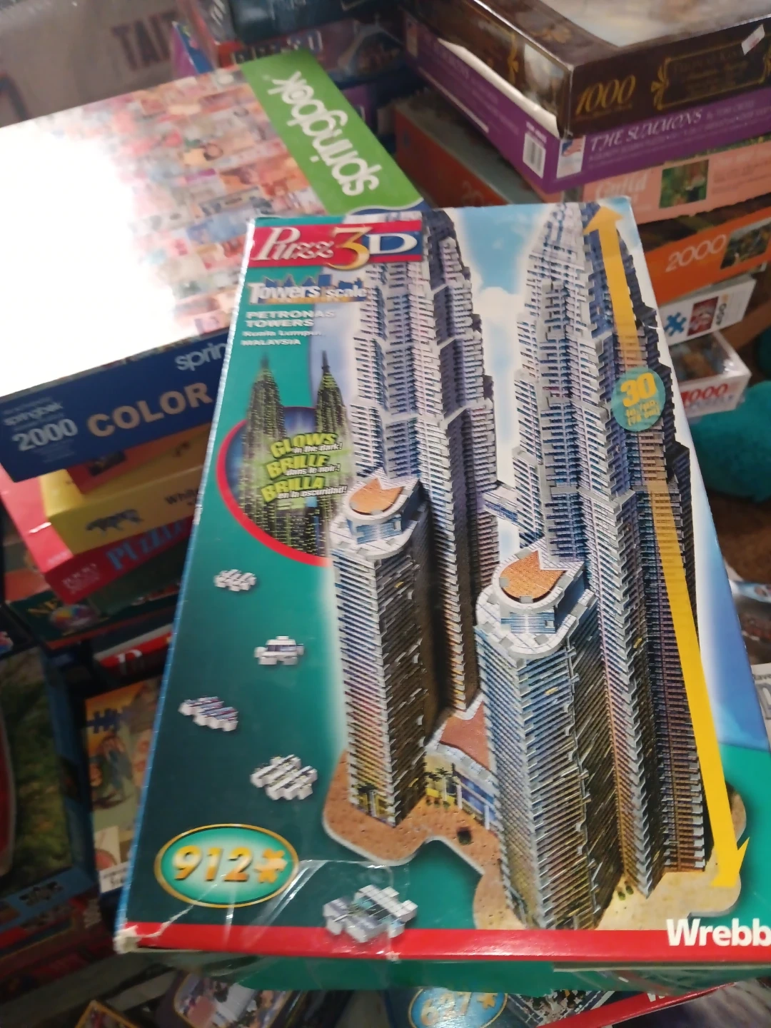 This is a Wrebbit 3D puzzle featuring the Petronas Towers. It has 912 pieces and includes pieces that glow in the dark. The puzzle is designed for ages 14 and up.