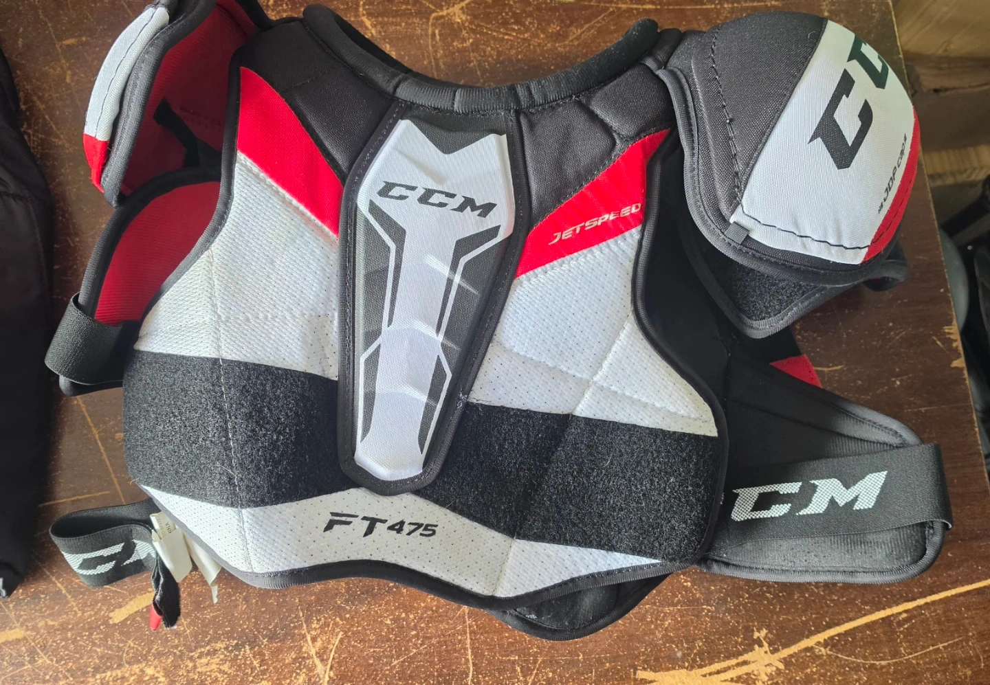 This lot includes CCM hockey pants and shoulder pads, along with Easton Shin Guards. The Easton shin guards are labelled 14" L and 14" R (36cm). The CCM gear is labelled FT475 and JetSpeed.