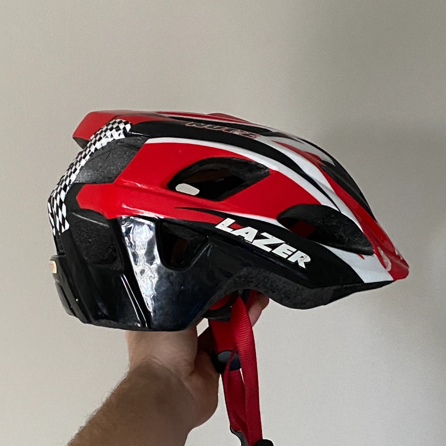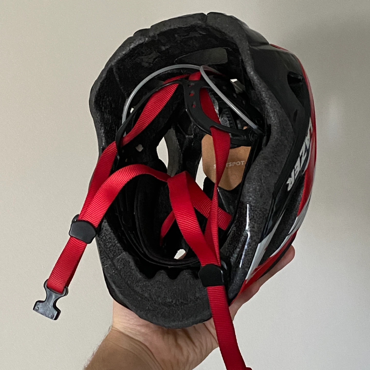 This Lazer bicycle helmet comes in a red, white, and black design. It features adjustable straps for a secure fit. Great for cycling adventures!