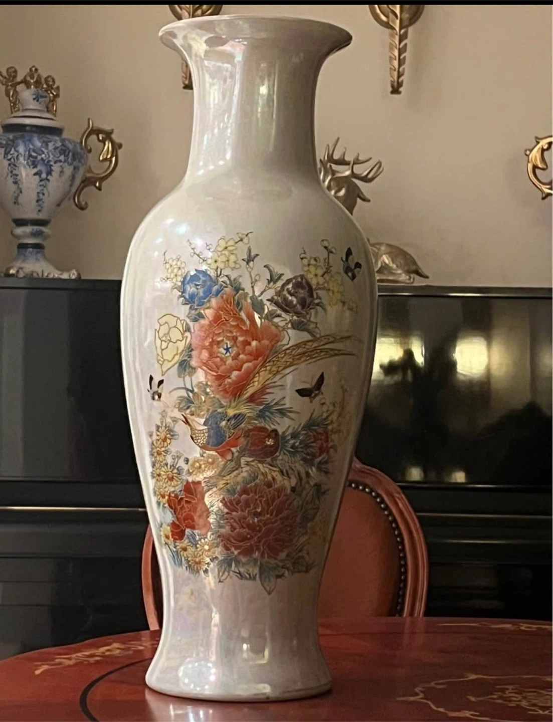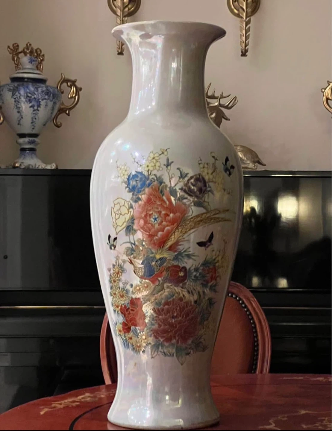 This is a beautiful pearlescent vase featuring a detailed bird and floral design. It has a fluted neck and a wide base, perfect for display. Adds an elegant touch to any room!