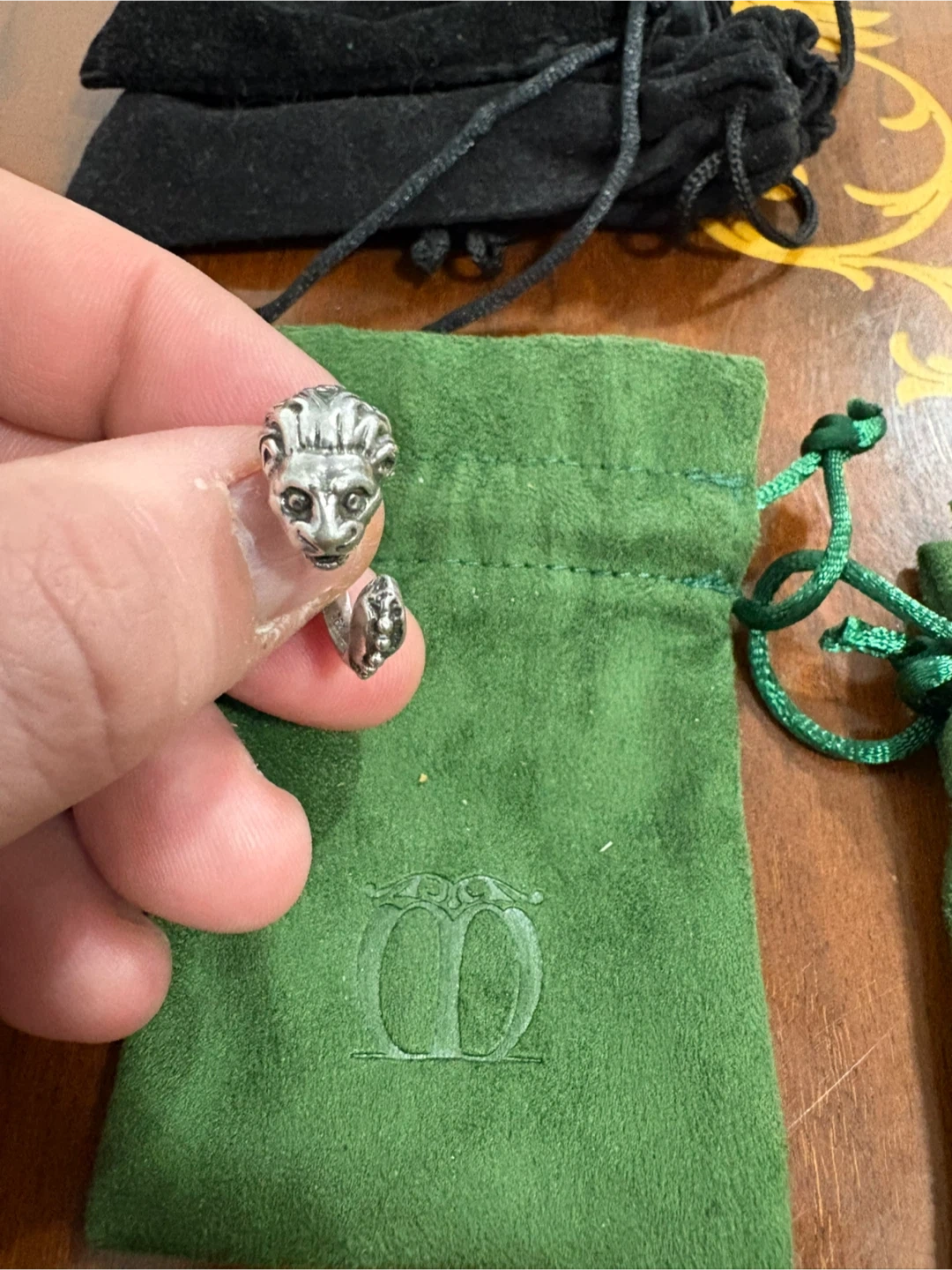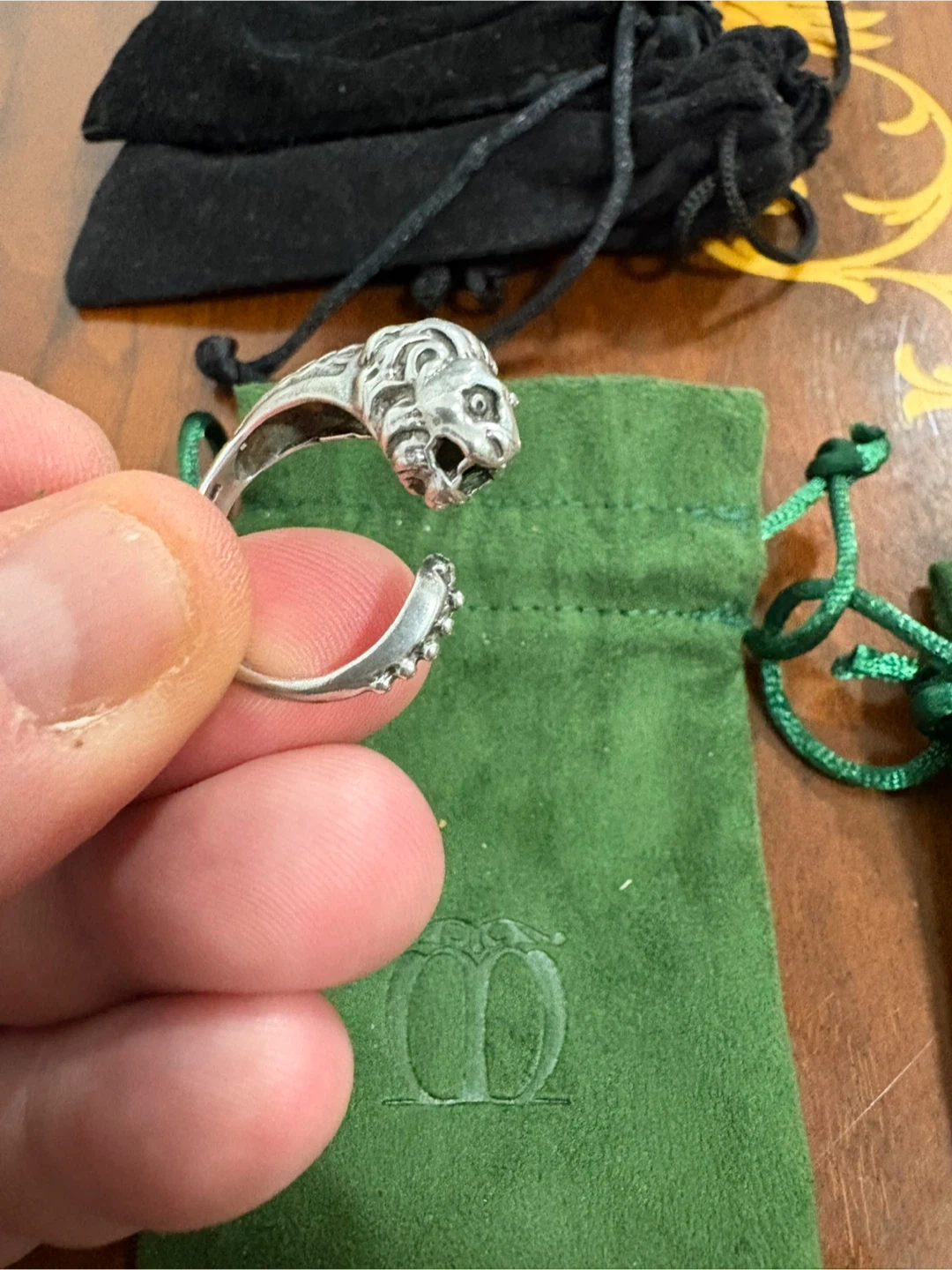 Sterling silver ring with a lion head design. Includes a green velvet pouch for storage. It's a unique statement piece!