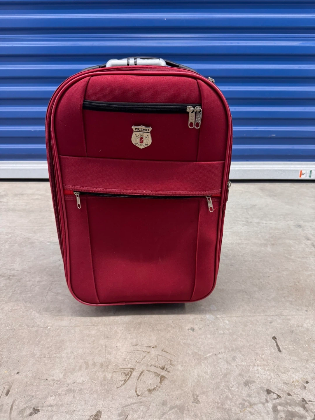 This group of carry-on luggage includes four rolling suitcases in red, black, burgundy and beige. The black suitcase is a Herschel brand. The burgundy suitcase is an Outbound brand. The red suitcase is Primo a the beige suitcase is Heys.