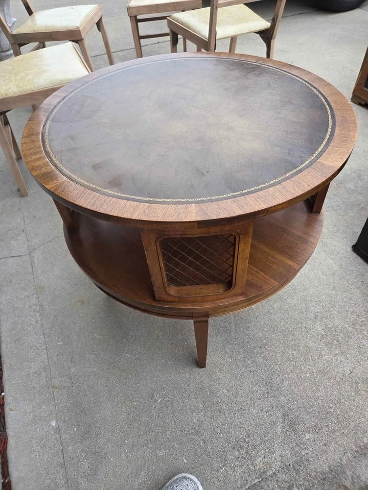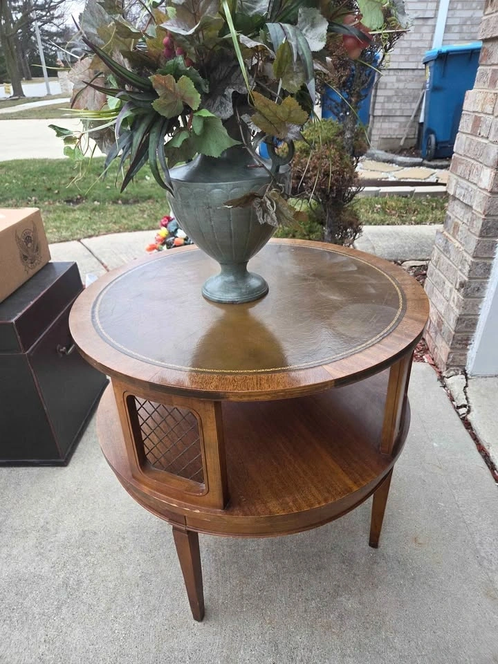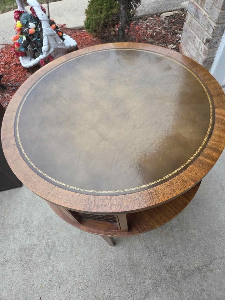 This vintage round mahogany Duncan Phyfe style drum table features a round top with a tooled leather inlay. Asking $95.
