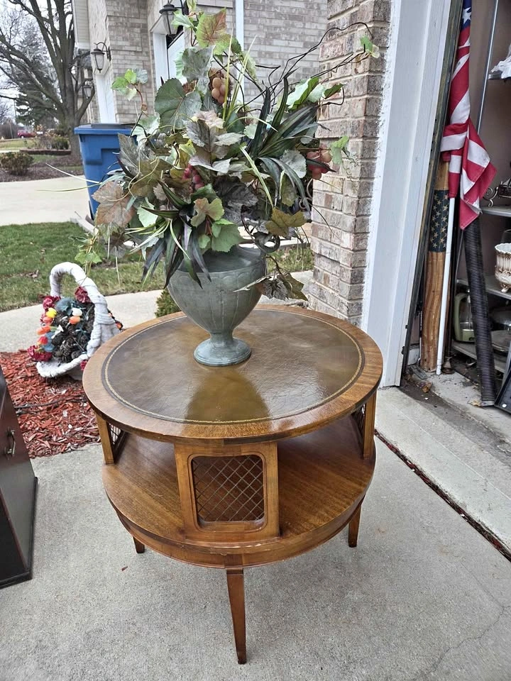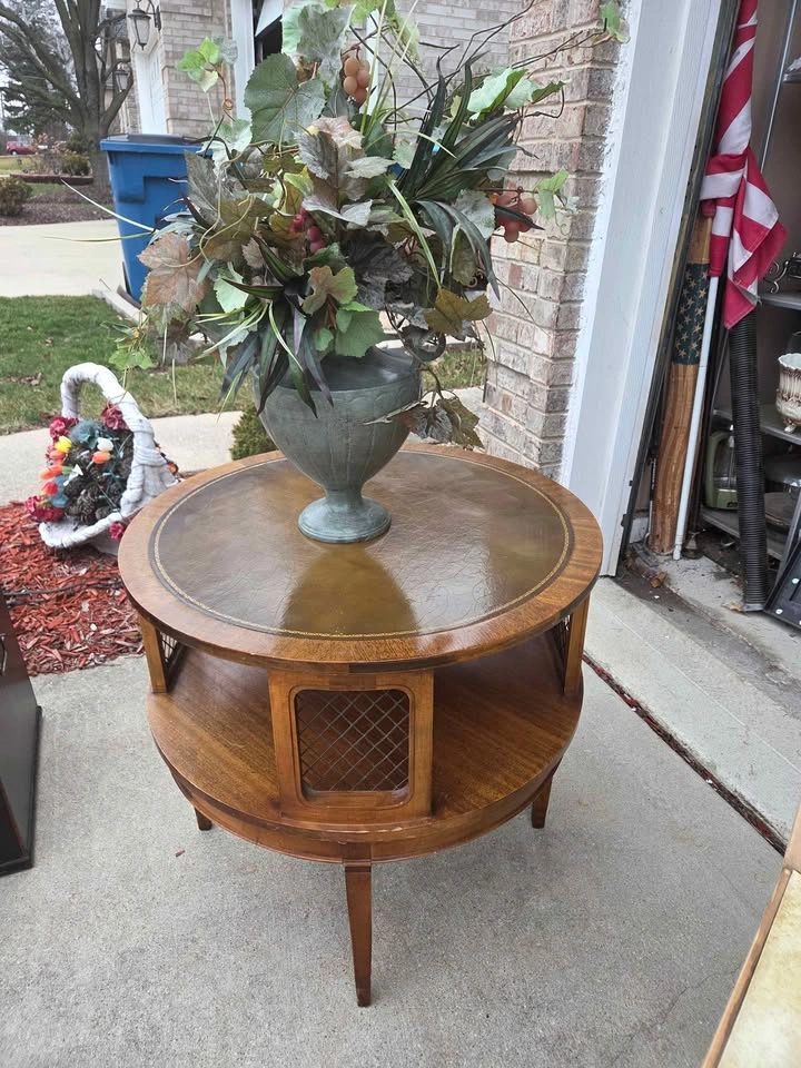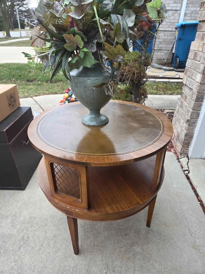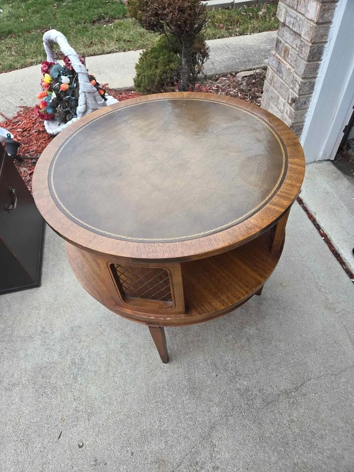 This vintage round mahogany Duncan Phyfe style drum table features a round top with a tooled leather inlay. Asking $95.