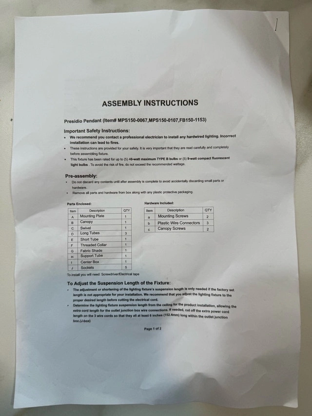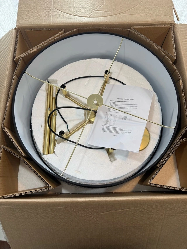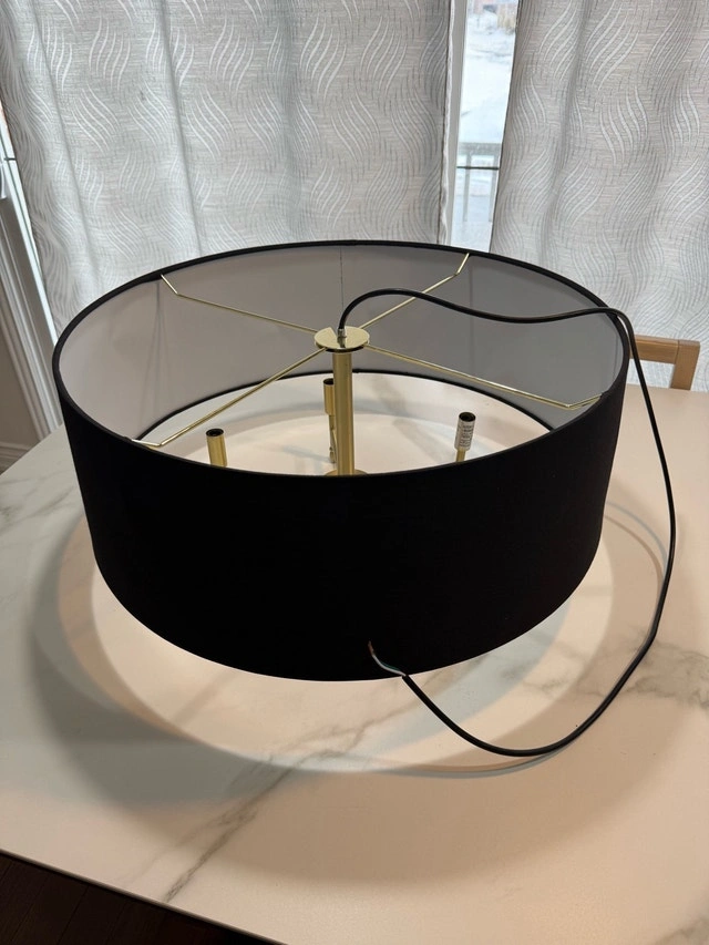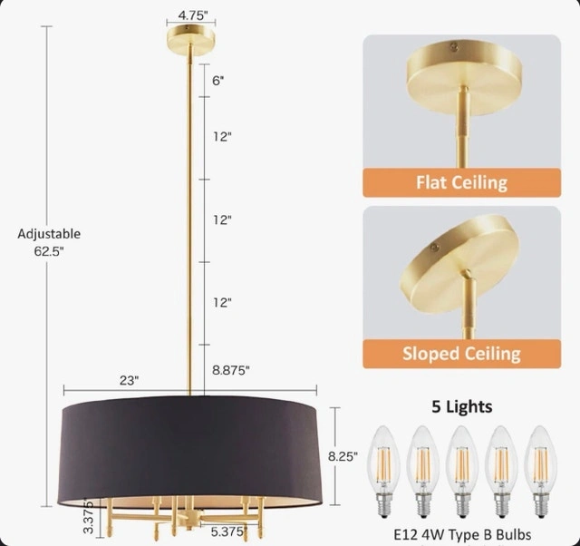 Elegant 5-light chandelier with a modern gold metal frame and a black tapered drum fabric shade for soft ambient lighting. Provides both upward and downward light. Dimmable with a compatible dimmer switch and E12 bulbs (not included). Adjustable hanging height includes 3x12” rods + 1x6” rod. Compatible with flat, sloped, and vaulted ceilings. Open bottom design for easy bulb replacement. Bulb Base: E12 / Candelabra (Max 40W per bulb). Voltage: 110V. Material: Iron frame with cotton/cotton-blend shade. Finish: Gold / Black. Overall Height (Hanging): 62.5”. Fixture Size: 11.25” H × 13.75” W × 13.75” D. Shade Size: 8.25” H × 24” W × 23” D. Weight: 2.67 lb. Perfect for dining rooms, bedrooms, living rooms, or entryways with modern, transitional, or classic décor. Note: If you look carefully at the photos, the inner part seems to have a slight dent, but it does not affect the overall appearance of the chandelier. I mentioned it here for more transparency.